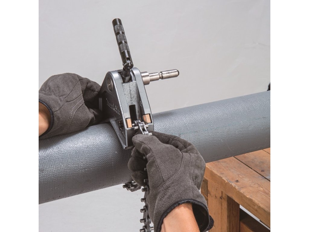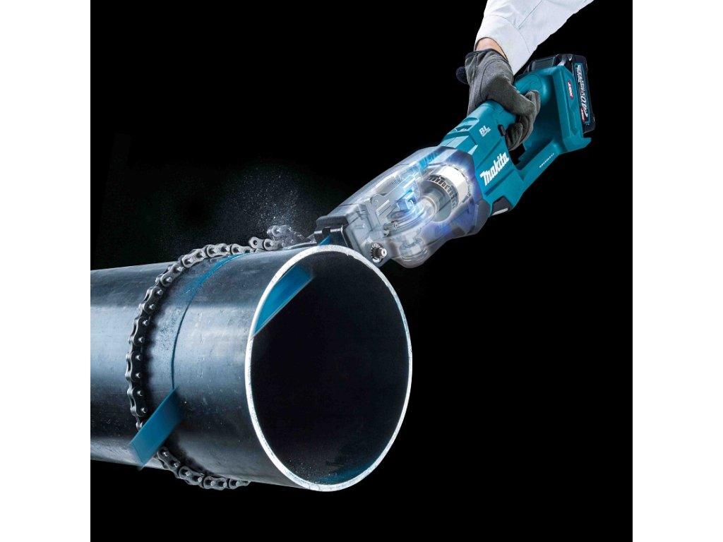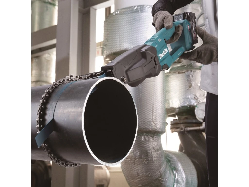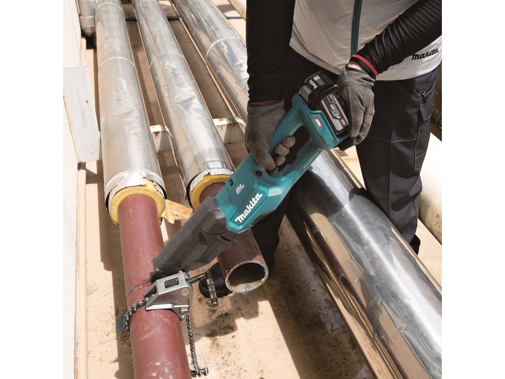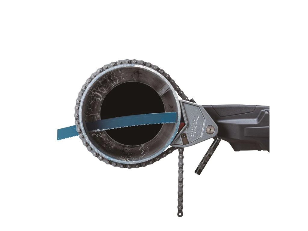 - Silná aku pila ocaska s možností upnutí materiálu pro velmi přesný řez trubky až do průměru 220 mm.