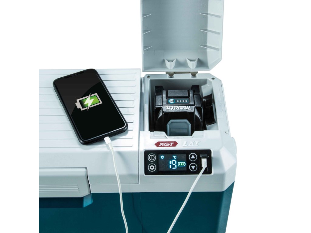 - Malý a šikovný pomocník na cestách fungující na akumulátor Li-ion XGT 40V, na akumulátor Li-ion LXT18V, síťový adaptér nebo autokonektor 12V