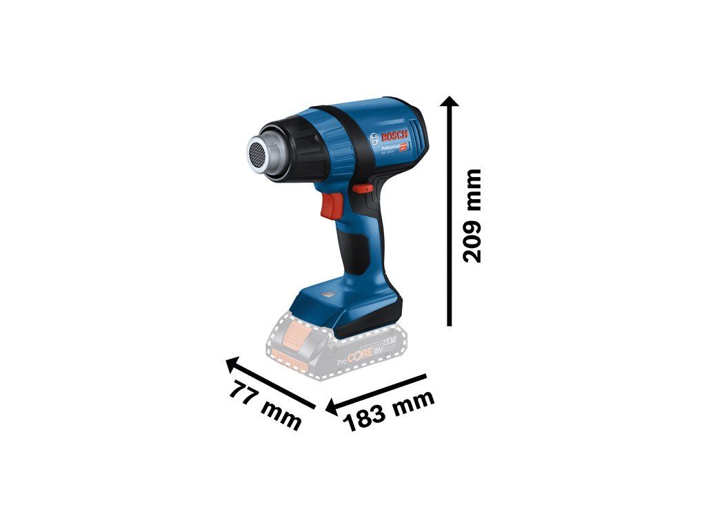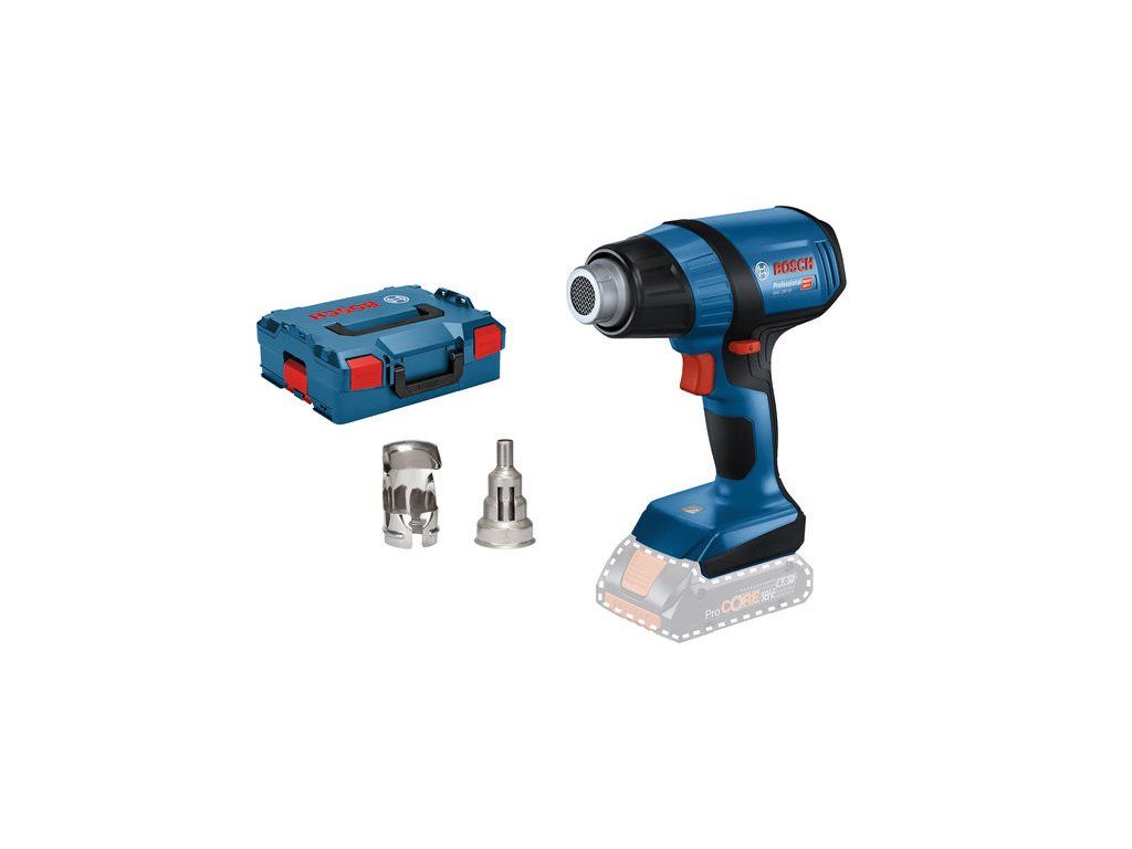 Akumulátorová horkovzdušná pistole GHG 18V-50, Práce na cestách – GHG 18V-50 Professional je určena na flexibilní použití v jakémkoli prostředí. Tato akumulátorová horkovzdušná pistole nabízí rychlé nahřátí na 300 °C za 6 sekund, a při dosahování nastavené teploty tak neztrácí žádný čas. Díky vynikající přenosnosti a flexibilitě se GHG 18V-50 skvěle hodí k použití v jakémkoli pracovním prostředí i na velkých staveništích bez dostupné elektrické sítě. Horkovzdušná pistole se dvěma úrovněmi teploty 300 °C a 500 °C a světlem LED zaručuje vždy snadné ovládání. GHG 18V-50 Professional je vhodná na různé způsoby použití, včetně smršťování trubek. Je kompatibilní se všemi dostupnými tryskami na naše síťové horkovzdušné pistole i se všemi akumulátory a nabíječkami Bosch Professional 18 V (profesionální 18V systém). Pro dosažení maximálního výkonu používejte ProCORE18V ≥ 4,0 Ah. Kompatibilní také s AMPShare, aliancí akumulátorů více značek. Při použití akumulátoru ProCORE18V 8.0 Ah při teplotě 300 °C je výdrž akumulátoru až 21 minut. L-BOXX 136 (1 600 A01 2G0); Reflektorová tryska, 32 × 33 mm (1 609 390 453); Redukční tryska, 9 mm (1 609 201 797)Doplňkové parametry