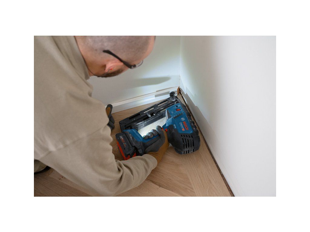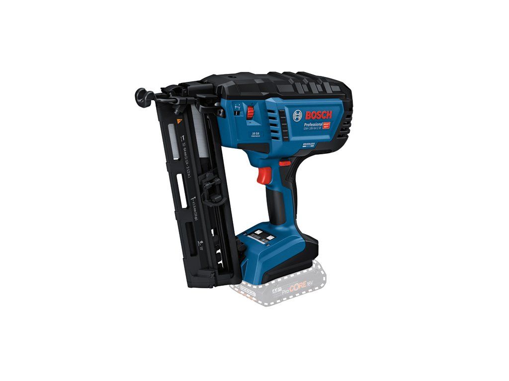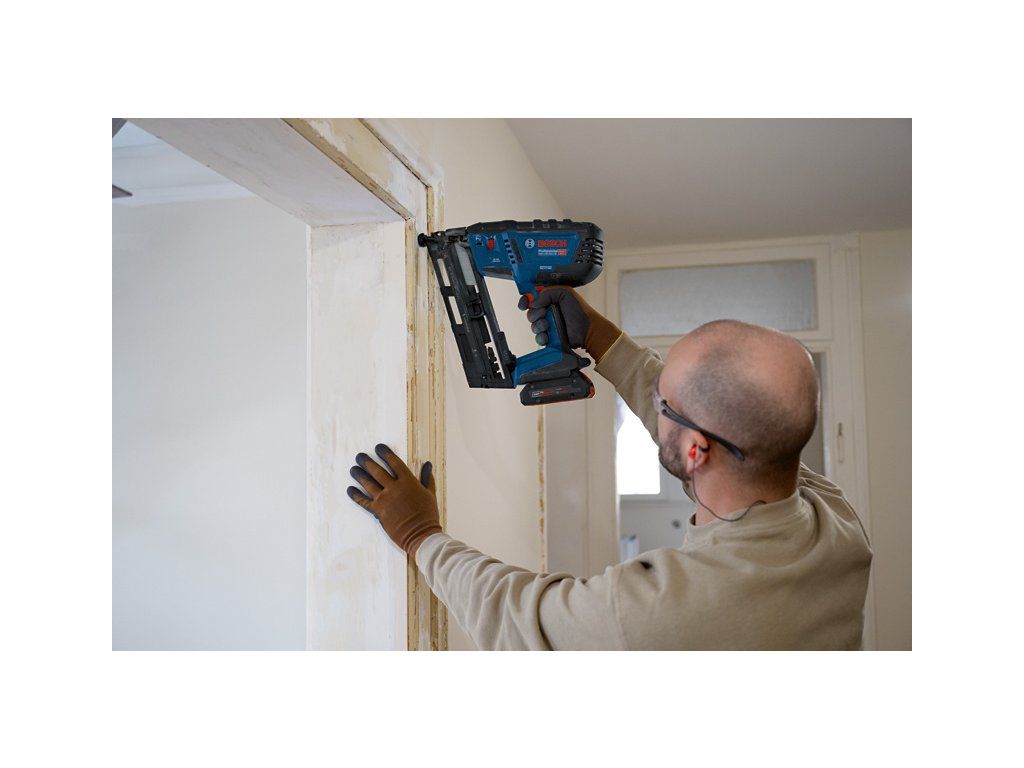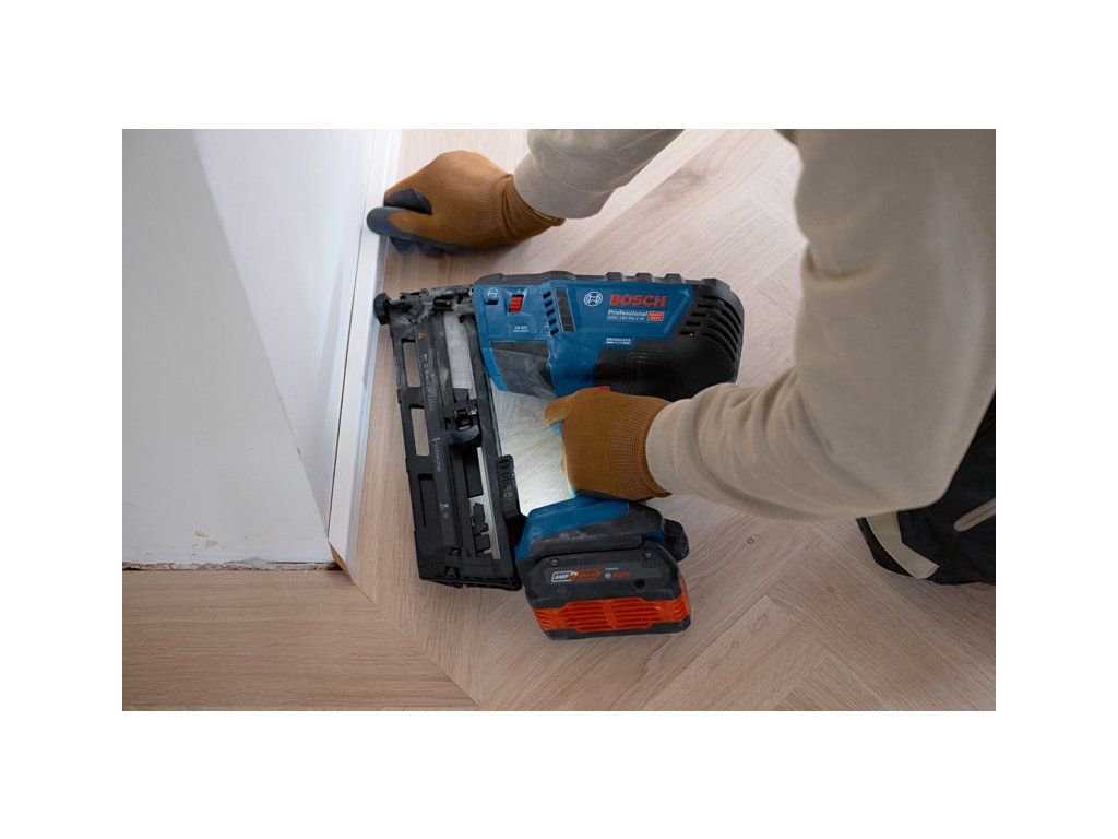 Akumulátorová hřebíkovačka do dřeva GNH 18V-64-2 M, Jako profesionální řemeslník chcete zatloukat hřebíky efektivně a bez přílišného namáhání ruky a paže. Naše výkonné bezuhlíkové akumulátorové nářadí GNH 18V-64-2 M Professional má díky své konstrukci velmi nízký zpětný ráz, takže je šetrné k vašemu zápěstí. Dbali jsme také na to, abyste mohli nářadí zapnout a ovládat pouze jednou rukou. S tímto nářadím získáte plný výkon pneumatické hřebíkovačky a zároveň se obejdete bez kompresorů, plynových kartuší a kabelů. Ideální na upevňování okenních a dveřních rámů, stropních lišt, montáž zábradlí na schodiště, montáž stropních a podlahových panelů s perem a drážkou (neviditelné připevnění), soklů a lišt. Kompatibilní s profesionálním 18V systémem Bosch a aliancí akumulátorů různých značek AMPShare. Je vybaveno vypínačem s jednoručním ovládáním, rozhraním člověk-stroj s upozorněním na údržbu, režimem jednorázové a kontaktní aktivace, snadno použitelným plynulým nastavením hloubky, ochranou proti nastřelování naprázdno, dvojitým LED světlem, kontaktní špičkou s širokým pohledem a odstraněním záseku bez použití nářadí. Použijte následující hřebíky: 32–64 mm, 16 ga (1,6 mm) a úhel podávání 20°. Kartonový boxDoplňkové parametry