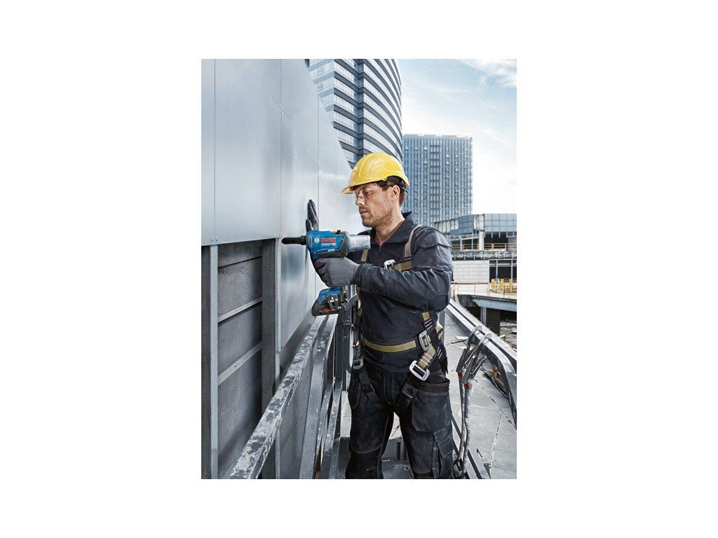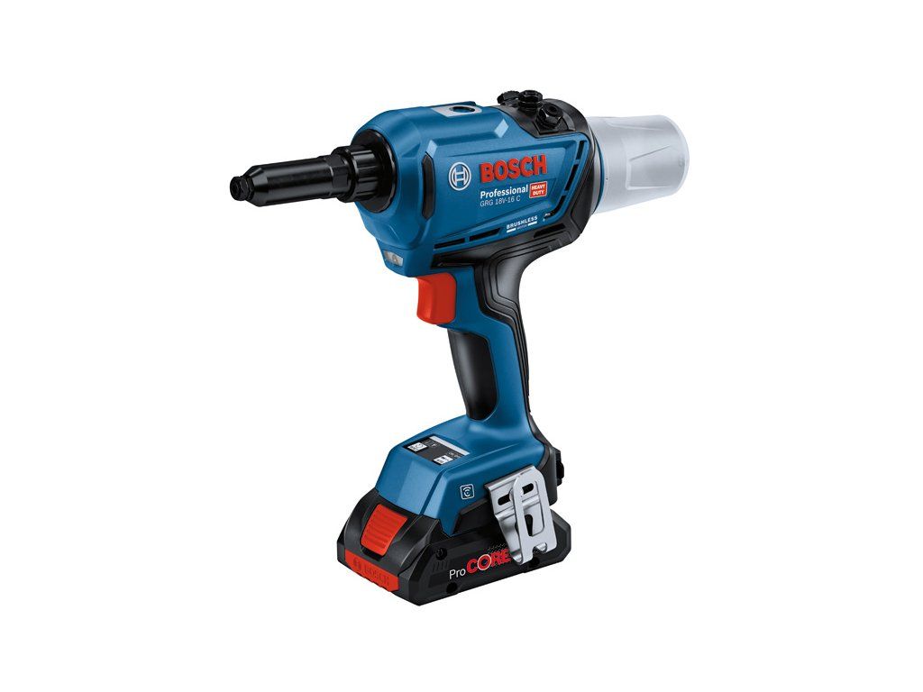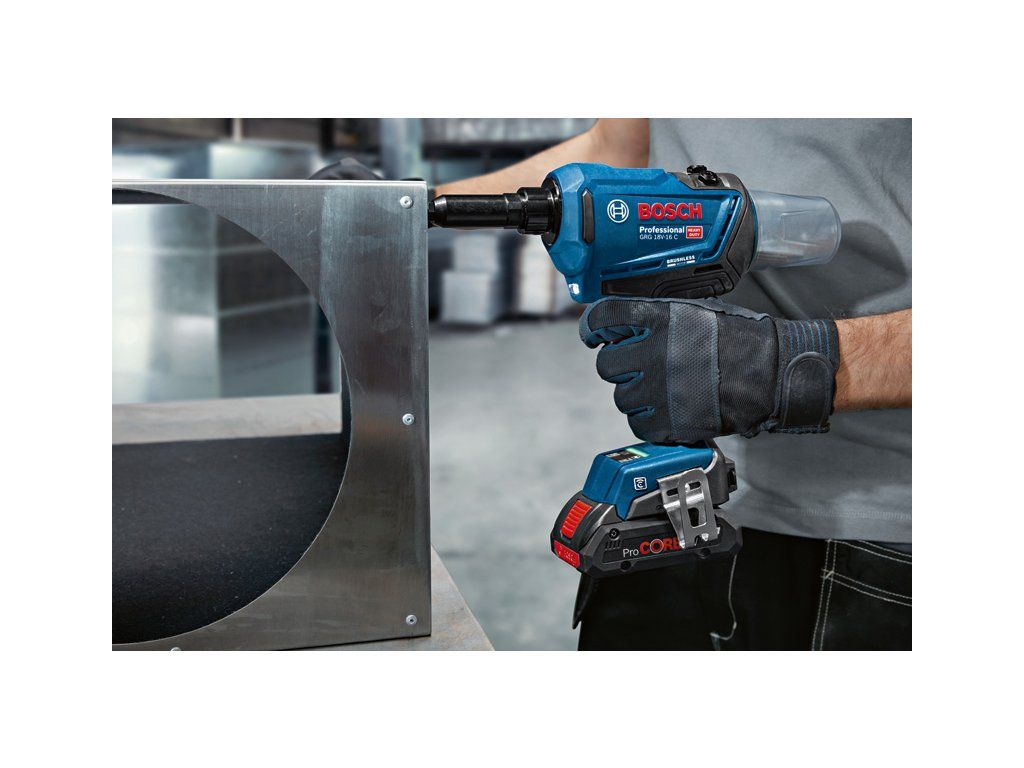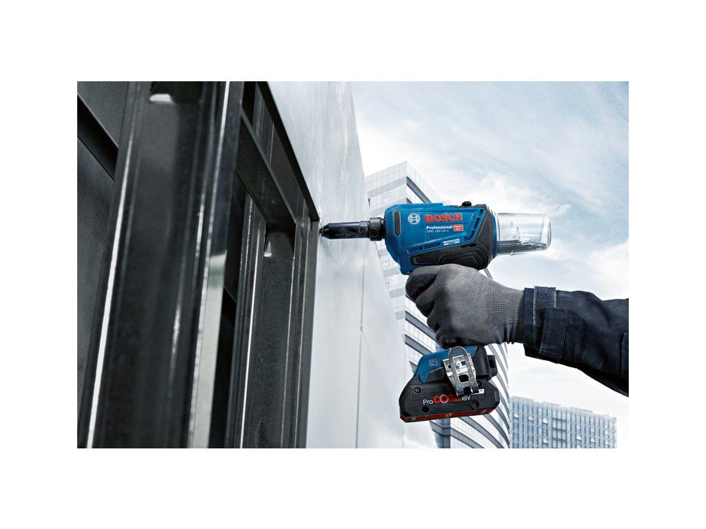 Akumulátorová nýtovací pistole GRG 18V-16 C, Výkonná akumulátorová nýtovací pistole GRG 18V-16 C Professional nabízí neomezenou svobodu pohybu bez kabelů a vybavení navíc, které se pojí s pneumatickým nářadím. S jednodušším sestavením a menší údržbou je zároveň i cenově výhodné. Tato nýtovací pistole se pyšní stejnou silou jako pneumatické nářadí a snadno nastřeluje nerezové nýty o průměru 3 až 6,4 mm při náročných pracích – a jediné nabití akumulátoru stačí na aplikaci více než 1 000 nýtů. Uživatelé si mohou zvolit automatický nebo ruční provoz podle svých osobních preferencí. Konektivita s aplikací Bosch zajišťuje méně časté prostoje a dodržování plánu údržby a provozu nářadí. Tato výkonná nýtovací pistole zajišťuje špičkové výsledky, flexibilitu a rychlost při výrobě originální dílů, například v oblasti vzduchotechniky nebo automobilového průmyslu, i při stavebních a montážních pracích. Nastřeluje nýty o průměru 3 až 6,4 mm do celé škály kombinací materiálů. Dodává se se čtyřmi koncovkami (3,0/3,2 mm, 4,0 mm, 4,8/5,0 mm, 6,4 mm), klíčem pro snadnou výměnu nosních dílů, závěsným kroužkem, nádobkou na trny a sponou na opasek. Má bezuhlíkový motor a indikátor stavu nástroje na HMI displeji. 2× akumulátor GBA 18V 2.0Ah (1 600 A00 1CD); Nabíječka GAL 18V-20 Professional (1 600 A02 1KT); L-BOXX 136 (1 600 A01 2G0)Doplňkové parametry