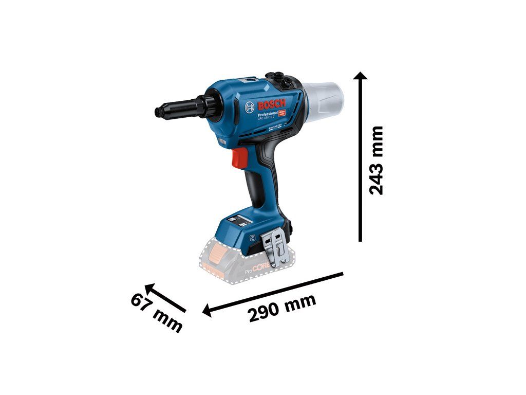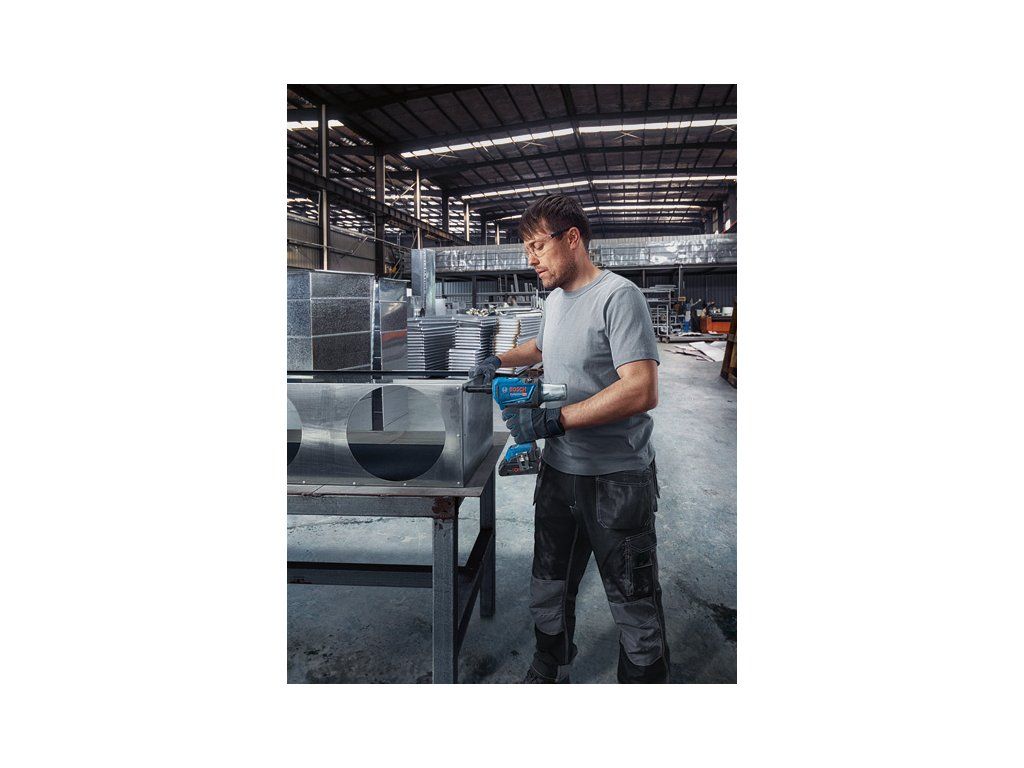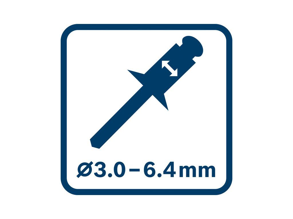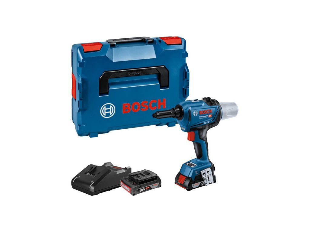 Akumulátorová nýtovací pistole GRG 18V-16 C, Výkonná akumulátorová nýtovací pistole GRG 18V-16 C Professional nabízí neomezenou svobodu pohybu bez kabelů a vybavení navíc, které se pojí s pneumatickým nářadím. S jednodušším sestavením a menší údržbou je zároveň i cenově výhodné. Tato nýtovací pistole se pyšní stejnou silou jako pneumatické nářadí a snadno nastřeluje nerezové nýty o průměru 3 až 6,4 mm při náročných pracích – a jediné nabití akumulátoru stačí na aplikaci více než 1 000 nýtů. Uživatelé si mohou zvolit automatický nebo ruční provoz podle svých osobních preferencí. Konektivita s aplikací Bosch zajišťuje méně časté prostoje a dodržování plánu údržby a provozu nářadí. Tato výkonná nýtovací pistole zajišťuje špičkové výsledky, flexibilitu a rychlost při výrobě originální dílů, například v oblasti vzduchotechniky nebo automobilového průmyslu, i při stavebních a montážních pracích. Nastřeluje nýty o průměru 3 až 6,4 mm do celé škály kombinací materiálů. Dodává se se čtyřmi koncovkami (3,0/3,2 mm, 4,0 mm, 4,8/5,0 mm, 6,4 mm), klíčem pro snadnou výměnu nosních dílů, závěsným kroužkem, nádobkou na trny a sponou na opasek. Má bezuhlíkový motor a indikátor stavu nástroje na HMI displeji. 2× akumulátor GBA 18V 2.0Ah (1 600 A00 1CD); Nabíječka GAL 18V-20 Professional (1 600 A02 1KT); L-BOXX 136 (1 600 A01 2G0)Doplňkové parametry