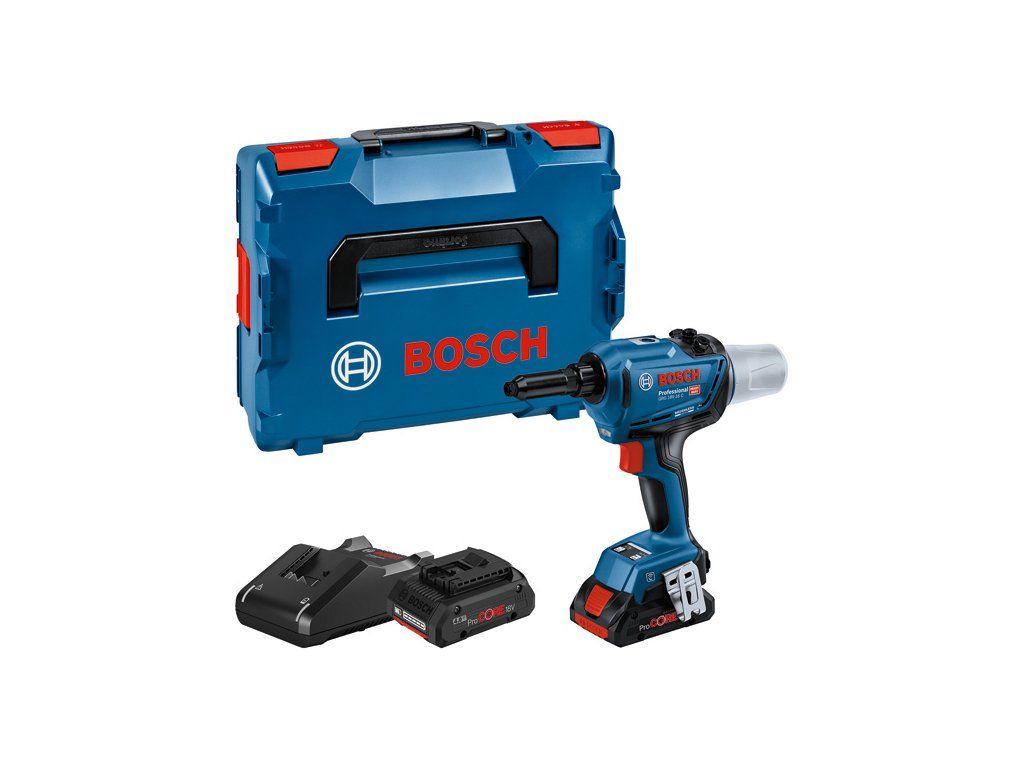 Akumulátorová nýtovací pistole GRG 18V-16 C, Výkonná akumulátorová nýtovací pistole GRG 18V-16 C Professional nabízí neomezenou svobodu pohybu bez kabelů a vybavení navíc, které se pojí s pneumatickým nářadím. S jednodušším sestavením a menší údržbou je zároveň i cenově výhodné. Tato nýtovací pistole se pyšní stejnou silou jako pneumatické nářadí a snadno nastřeluje nerezové nýty o průměru 3 až 6,4 mm při náročných pracích – a jediné nabití akumulátoru stačí na aplikaci více než 1 000 nýtů. Uživatelé si mohou zvolit automatický nebo ruční provoz podle svých osobních preferencí. Konektivita s aplikací Bosch zajišťuje méně časté prostoje a dodržování plánu údržby a provozu nářadí. Tato výkonná nýtovací pistole zajišťuje špičkové výsledky, flexibilitu a rychlost při výrobě originální dílů, například v oblasti vzduchotechniky nebo automobilového průmyslu, i při stavebních a montážních pracích. Nastřeluje nýty o průměru 3 až 6,4 mm do celé škály kombinací materiálů. Dodává se se čtyřmi koncovkami (3,0/3,2 mm, 4,0 mm, 4,8/5,0 mm, 6,4 mm), klíčem pro snadnou výměnu nosních dílů, závěsným kroužkem, nádobkou na trny a sponou na opasek. Má bezuhlíkový motor a indikátor stavu nástroje na HMI displeji. 2× akumulátor ProCORE18V 4.0Ah (1 600 A01 6GB); L-BOXX 136 (1 600 A01 2G0); Rychlonabíječka GAL 18V-40 Professional (1 600 A01 9RJ)Doplňkové parametry