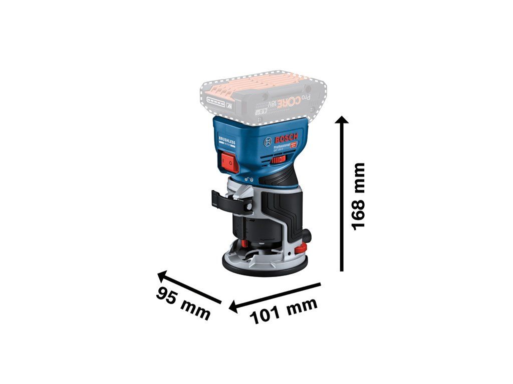 Akumulátorová ohraňovací frézka GKF 18V-8, Kombinuje výhody špičkových funkcí, výkonného bezuhlíkového motoru a kompatibility s širokou škálou příslušenství, které uspokojí všechny požadavky ohraňovacího frézování, od lehkého profilování hran až po náročnější frézování ploch. Tato 18V ohraňovací frézka má nejkompaktnější výšku na trhu, která minimalizuje hmotnost horní části a maximalizuje kontrolu nad nářadím, hands-free zámek vřetena pro bezproblémovou výměnu bitů a jemné nastavení hloubky řezu, které vám poskytuje vynikající zážitek z frézování. GKF 18V-8 je navíc jedinou 18V ohraňovací frézkou na světě s adaptéry na vysavač pro frézování ploch i hran, které zaručují vysoce efektivní odvod prachu ve všech situacích. Boční doraz (2 608 000 331); Odsávací adaptér na povrchové frézování (2 608 190 061); Odsávací adaptér na frézování hran (2 608 190 062); Kryt na piliny (2 608 190 065); L-BOXX 136 (1 600 A01 2G0); Vložka do L-BOXX (1 600 A03 51W); Upínací kleština s přesuvnou maticí 8 mm (2 608 570 134); Klíč 17 mm (2 609 110 438)Doplňkové parametry