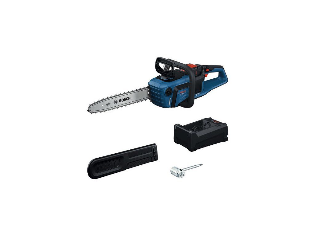 Akumulátorová řetězová pila GKE 18V-40, Akumulátorová řetězová pila GKE 18V-40 Professional je dokonalým řešením pro všechny vaše tesařské práce a venkovní zahradnické práce. Její výkonný bezuhlíkový motor poskytuje silný výkon při nízké hladině hluku, což vám umožní pracovat v oblastech citlivých na hluk, jako jsou obytné oblasti nebo firemní areály – to vše bez vypouštění výfukových plynů. Její elektronická brzda motoru zastaví řetěz rychle po uvolnění spouště. Systém OptiCut přizpůsobuje otáčky a krouticí moment příslušné pracovní situaci, a zabraňuje tak nepříjemnému zadrhávání při vyšším pracovním zatížení. Kombinace bezuhlíkového motoru a OptiCut přináší vysoký výkon a plynulé řezání v jednom výrobku. Lišta o délce 40 cm umožňuje plynulé řezání trámů, dřeva a silných větví, takže je ideálním nářadím pro širokou škálu prací. Tato řetězová pila se pyšní bezproblémovým rozběhem, nízkými nároky na údržbu a dlouhou životností. Kompatibilní s profesionálním 18V systémem Bosch a aliancí akumulátorů různých značek AMPShare. Přímo na motorové pile je uložen montážní klíč, který je tak vždy po ruce pro snadné napnutí a údržbu řetězu. Má průhlednou olejovou nádrž, která zabraňuje únikům a umožňuje snadnou kontrolu hladiny oleje. Kovové hroty zvyšují kontrolu a přesnost při řezání. Klíč (1 617 S02 0ST); Kryt řetězu (1 600 A02 0C8); 1× EXBA18V-55 (1 607 A35 1NU); Rychlonabíječka GAL 12V/18V-80 (1 600 A03 7CH)Doplňkové parametry
