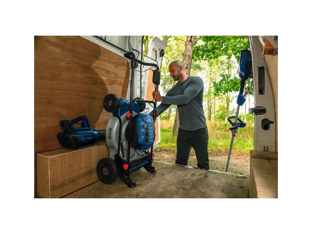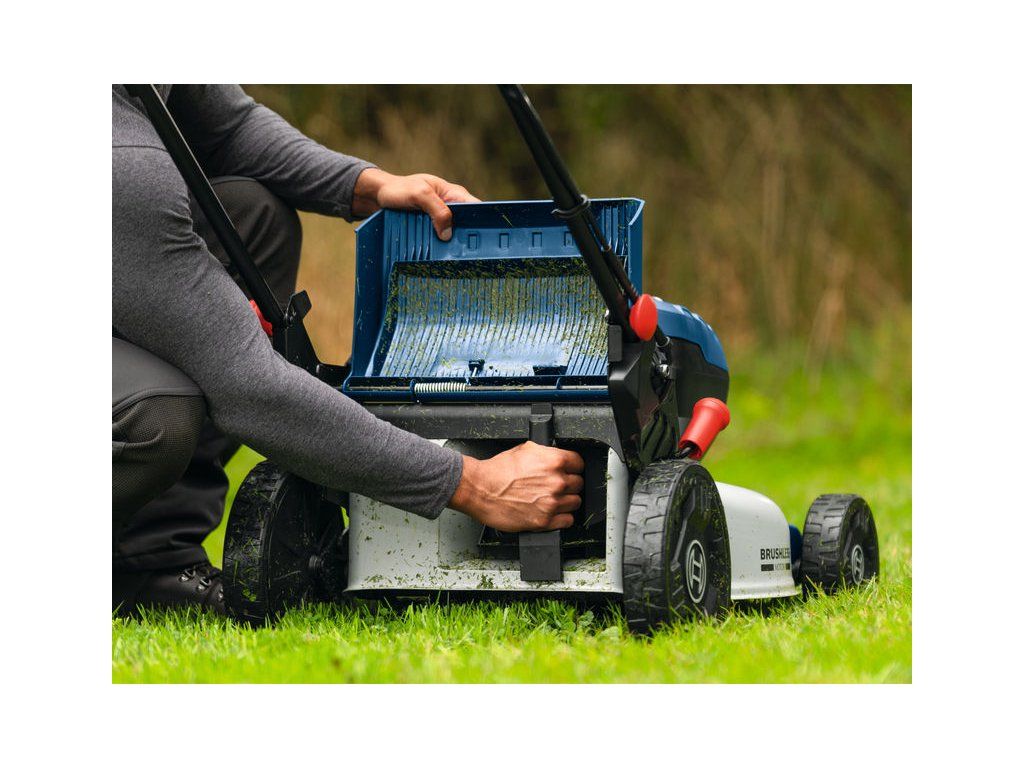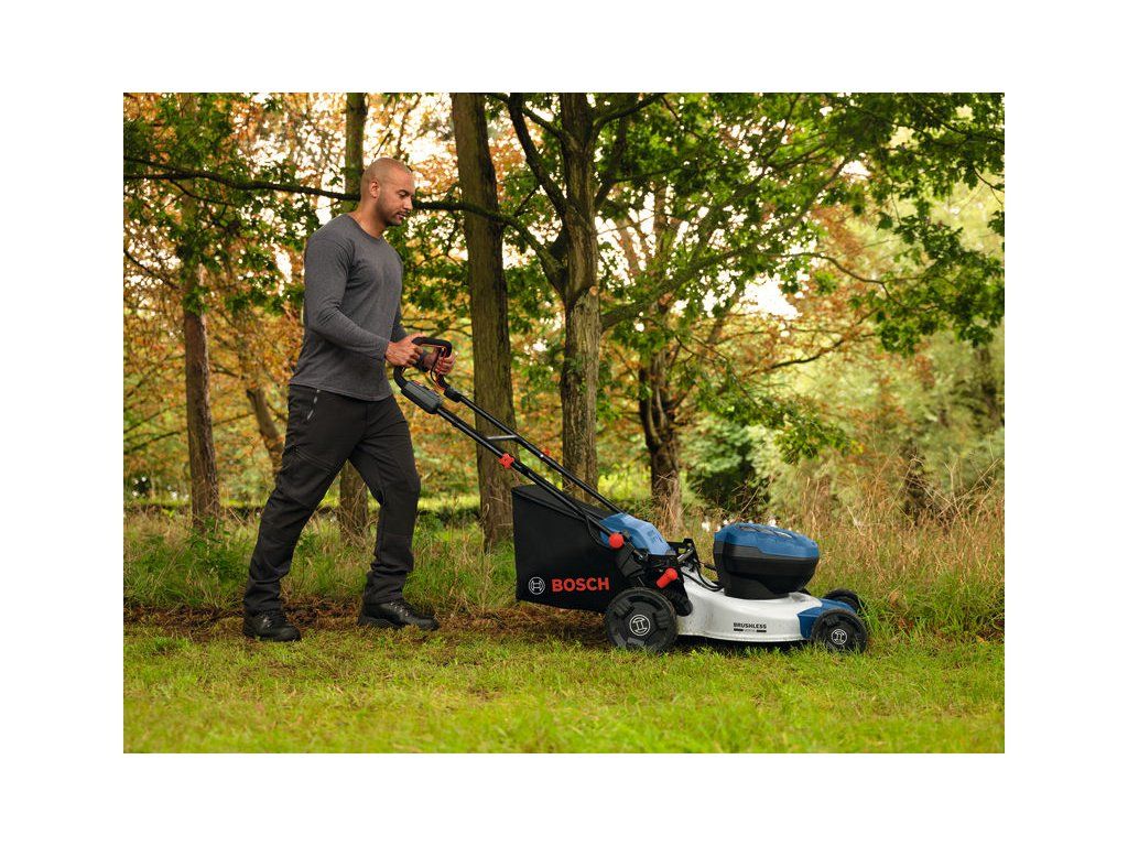 Akumulátorová sekačka na trávu GRA18V2-46SP, Údržba větších trávníků je často spojena s náročnými požadavky, které vyžadují výkonnou sekačku. Sekačka PRO GRA18V2-46SP s pojezdem, akumulátorovým pohonem a kovovým tělem je silný a spolehlivý pomocník, který je součástí systému Bosch Professional 18V.“ Robustní bezuhlíkový motor je poháněn dvěma 18V akumulátory a zajišťuje vysoký výkon, delší dobu chodu a dlouhou životnost. Plynulá regulace rychlosti umožňuje zvolit si ideální pracovní rychlost – mezi 2,0 a 6,4 km/h – při sekání nebo přepravě sekačky. Funkce pozvolného rozběhu zajišťuje bezproblémové sečení a gumová kola poskytují trakci potřebnou pro náročnější podmínky. Skládací rukojeť umožňuje kompaktní složení sekačky pro snadnou přepravu s možností skladování sekačky ve svislé poloze. Ergonomická rukojeť s měkkým povrchem a 2-stupňovým nastavením výšky podporuje zdravější držení těla a zajišťuje větší pohodlí i menší únavu při práci. Sekačka na trávu má průměr sečení 46 cm a nabízí 6-stupňové nastavení výšky sečení od 30 do 70 mm. Kovový trup sekačky je extrémně robustní; odolává vyššímu zatížení a prodlužuje životnost stroje. Textilní vak na trávu o objemu 60 litrů a mulčovací nástavec umožňují flexibilně volit mezi sběrem posečené trávy nebo jejím použitím jako přírodního hnojiva pro trávník. Kompatibilní s profesionálním 18V systémem Bosch a aliancí akumulátorů různých značek AMPShare Tato sekačka na trávu s kovovým trupem a pojezdem je vybavena plynulou regulací otáček a je dodávána s látkovým košem na trávu o objemu 60 litrů a mulčovacím nástavcem Kartonová krabice; Mulčovací zátka (1 600 A02 R3X); 2× EXBA18V-55 (1 607 A35 1NU); 2× rychlonabíječka GAL 12V/18V-80 (1 600 A03 7CH)Doplňkové parametry