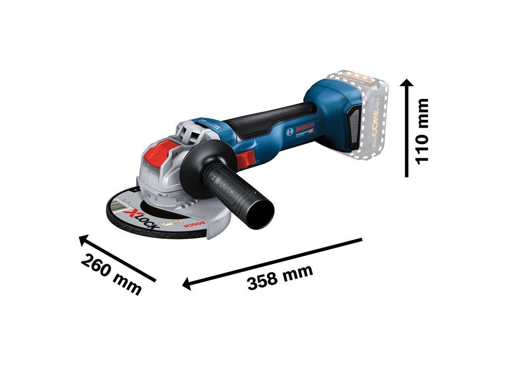 Akumulátorová úhlová bruska s X-LOCK GWX 18V-10, Malá akumulátorová úhlová bruska GWX 18V-10 Professional se systémem X-LOCK poskytuje lepší úroveň výkonu a ovládání nářadí v kategorii 18 V. Výkon s akumulátorem odpovídá výkonu síťové brusky s příkonem 1 000 W díky jejímu výkonnému bezuhlíkovému motoru a technologii ProCORE18V. Tato malá úhlová bruska je vybavená bezklíčovým upínacím systémem X-LOCK, který zajišťuje rychlou a pohodlnou výměnu příslušenství. Navíc je vybavena funkcí Drop Control, KickBack Control a X-Brake, které poskytují maximální ochranu uživatele a pohodlí. Nářadí je určeno na řezání a broušení kovu, kamene a betonu. Je kompatibilní s nástavci na odsávání prachu GDE 125 EA-T Professional a GDE 115 / 125 FC-T Professional i se všemi akumulátory a nabíječkami Bosch Professional 18 V (profesionální 18V systém). Kompatibilní také s AMPShare, aliancí akumulátorů více značek. GWX 18V-10 Professional je také vybaven ochranným krytem a rukojetí s Vibration Control. Kartonová krabice; Ochranný kryt (1 605 510 365); Přídavná rukojeť (1 602 025 024)Doplňkové parametry