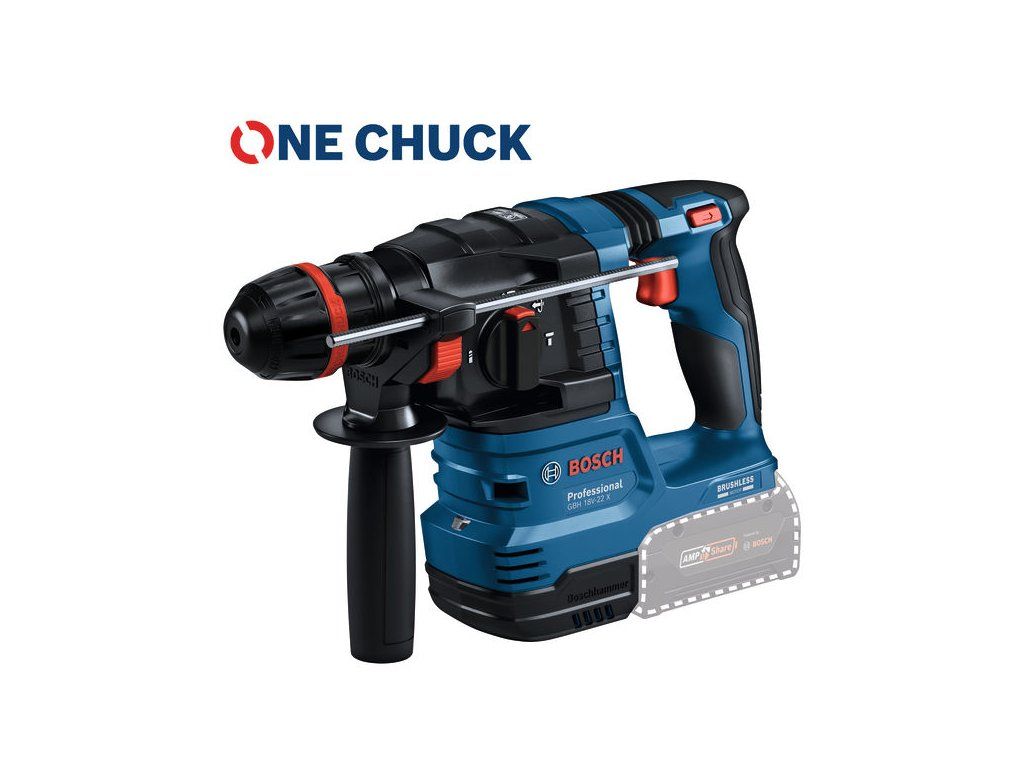 Akumulátorové vrtací kladivo s ONECHUCK GBH 18V-22 X, GBH 18V-22 X Professional je nabité silou a funkcemi, které vrtání povýší na novou úroveň, s mimořádnou efektivitou, bezpečností a kontrolou. Plně nabitý akumulátor zvládne více děr a silný bezuhlíkový 18V motor Bosch v kombinaci s konstantní rychlostí zajišťuje stabilní výkon. Vyznačuje se zvýšenou ochranou uživatele vůči náhodným zásekům a menším působením vibrací díky funkcím KickBack Control a Vibration Control. Přispívá rovněž k bezprašnému pracovnímu prostředí díky odsávacímu nástavci Auto Power GDE 18V-12 / GDE 12. Vybaveno sklíčidlem ONECHUCK, jediným, do kterého pasují jak vrtáky SDS plus, tak i vrtáky s válcovou a šestihrannou stopkou pro širokou škálu aplikací GBH 18V-22 X Professional je výkonný silák své třídy na vrtání s příklepem a sekání do betonu a cihel i vrtání do dřeva a oceli díky funkci ONECHUCK. Přináší zjednodušený a mnohem efektivnější postup práce s konstantní rychlostí, minimálními vibracemi a bezprašným pracovním prostředím. Kartonový box; Hloubkový doraz (1 613 001 009); Přídavná rukojeť (1 619 P16 971)Doplňkové parametry