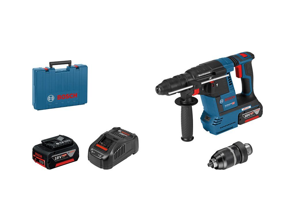 Akumulátorové vrtací kladivo s SDS plus GBH 18V-26 F, Toto nářadí s rychlovýměnným sklíčidlem je univerzální silák v kategorii akumulátorových vrtacích kladiv Bosch SDS plus a dokonale se hodí pro každodenní používání. Volitelná jednotka pro odsávání prachu GDE 18V-16 Professional je integrována do kladiva, a představuje tak samostatné řešení prachu HEPA pro maximální mobilitu. Vrtací kladivo se rovněž pyšní funkcemi KickBack Control a Electronic Precision Control (EPC) pro lepší ovládání nářadí a zvýšenou ochranu uživatele. Výkonný motor zajišťuje 2,6 J příklepové energie, která zaručuje vysokou rychlost úběru materiálu. Toto nářadí je určeno na vrtání a sekání do betonu, zdiva, dřeva a kovu. Je kompatibilní s různými nástavci na odsávání prachu i se všemi akumulátory a nabíječkami Bosch Professional 18 V (profesionální 18V systém). Kompatibilní také s AMPShare, aliancí akumulátorů více značek. Toto nářadí také obsahuje různé další funkce, jako je Constant Speed, bezuhlíkový motor, Electronic Motor Protection (EMP), LED světlo, Rotation Control Clutch, Variable Speed, Vario Lock a Vibration Control. Přídavná rukojeť ( 2 602 025 141); Příruční kufr; Hloubkový doraz 210 mm (1 613 001 010); Rychlonabíječka GAL 1880 CV (1 600 A00 B8G); Utěrka na nářadí; Rychlovýměnné sklíčidlo 13 mm (2 608 572 212); Výměnné sklíčidlo SDS plus (2 608 572 213); 2× akumulátor GBA 18V 6.0Ah (1 600 A00 4ZN)Doplňkové parametry