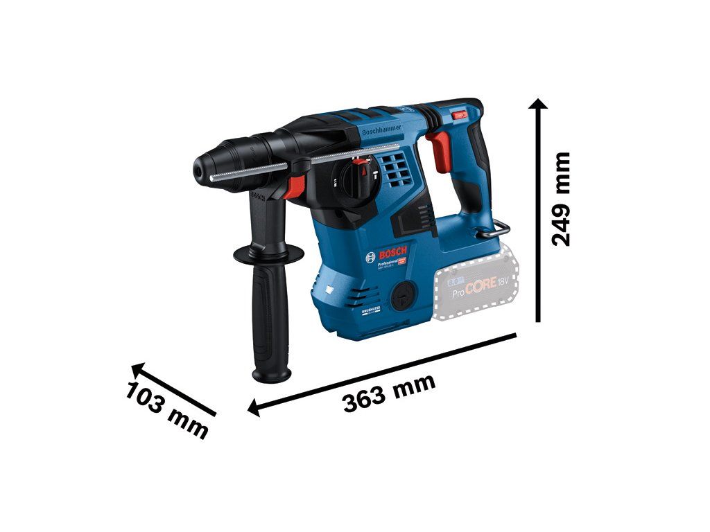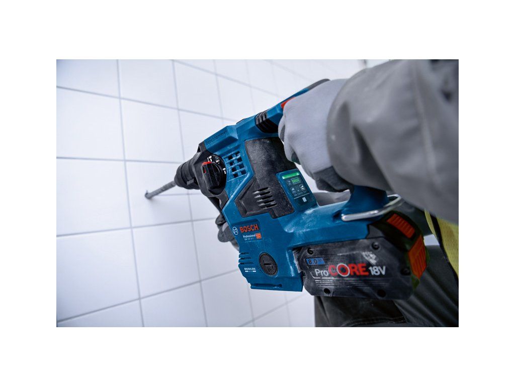 Akumulátorové vrtací kladivo s SDS plus GBH 18V-28 C, Akumulátorové nářadí GBH 18V-28 C Professional od firmy Bosch je určeno pro všechny, kdo touží po výkonu síťového nářadí se svobodu bez kabelů. Toto vrtací kladivo se vyznačuje výkonným bezuhlíkovým motorem, který se svým osvědčeným příklepovým mechanismem přináší energii až 3,3 J. Snadno čitelný displej HMI zobrazuje stav nářadí a umožňuje uživateli výběr ze tří různých pracovních režimů (Auto, Favorite, Soft) pro dokonalou kontrolu při každé práci. S nainstalovaným volitelným modulem como (GCY 42) lze nářadí GBH 18V-28 C připojit k aplikaci Bosch Toolbox a dále si upravovat nastavení podle svých potřeb. Vibration Control, KickBack Control a kompatibilita s GDE 18V-16 pro bezprašné vrtání zajišťuje komplexní nabídku prvků na ochranu uživatele. Toto vrtací kladivo je ideální na příklepové vrtání do betonu, kamene a zdiva. Je kompatibilní se všemi 18V akumulátory a nabíječkami Bosch Professional. Pro bezprašné a bezpečnější pracovní prostředí lze k nářadí snadno připojit vysavač GDE 18V-16 Professional. Kompatibilní také s AMPShare, aliancí akumulátorů více značek. Vyznačuje se rovněž háčkem na ukládání a světlem LED. Kartonový box; Přídavná rukojeť ( 2 602 025 191); Hloubkový doraz (1 613 001 009); Čisticí tkanina (1 619 200 413); Tuba s mazacím tukem (číslo náhradního dílu 1 615 430 010)Doplňkové parametry