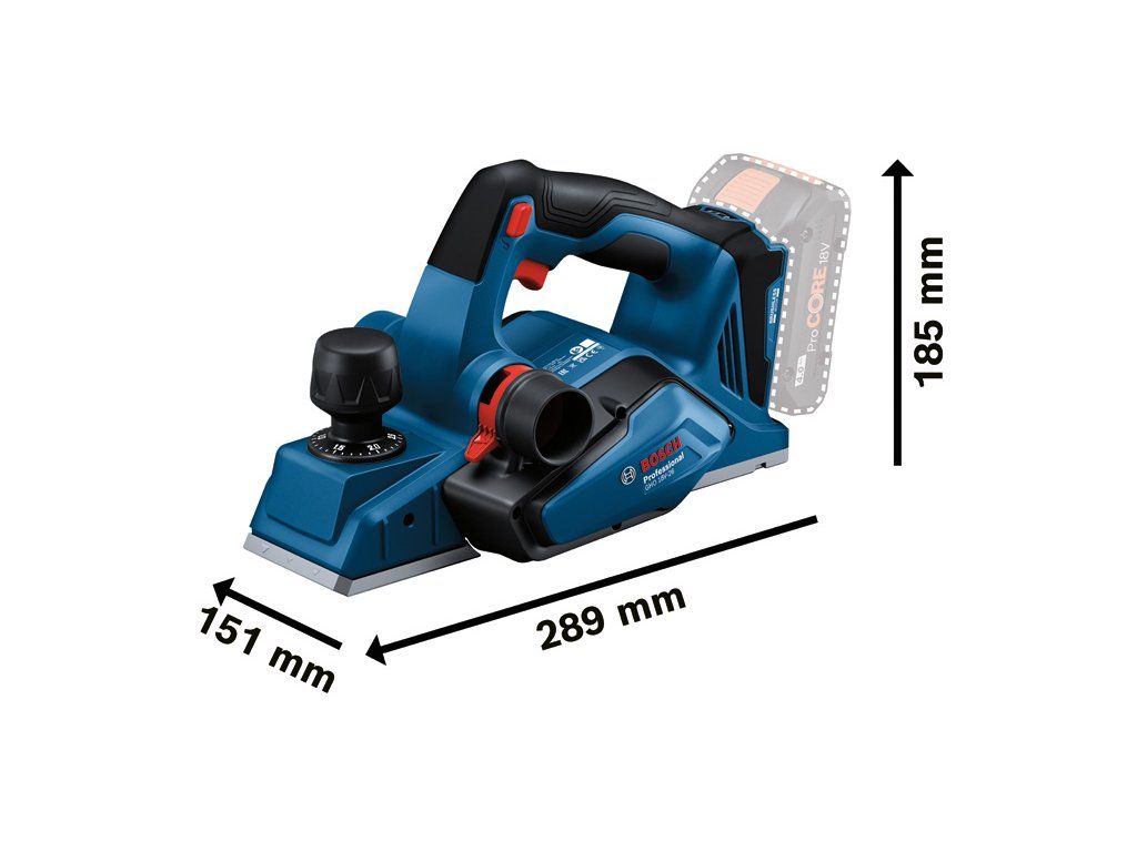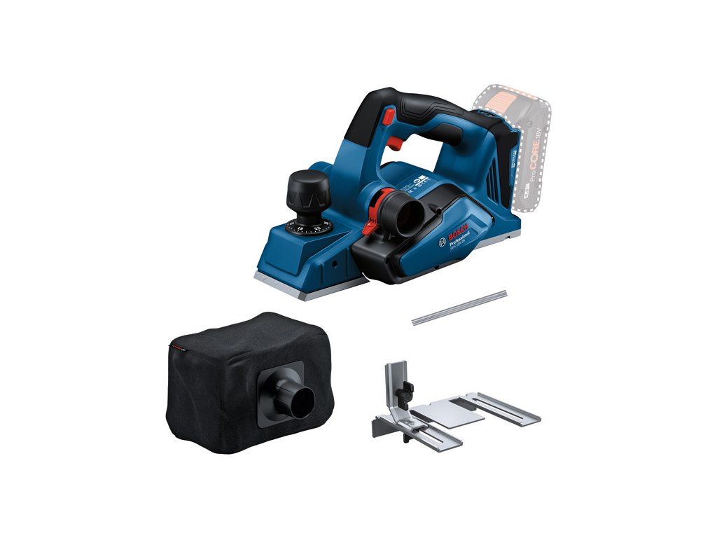 Akumulátorový hoblík GHO 18V-26, Toto nářadí je vhodné na hoblování přírodních i opracovaných dřevěných materiálů a na odstraňování materiálů pro vytvoření rovného povrchu. Zaručeně rovná plocha v každé rovině Nabízí motorovou brzdu, která zastaví buben nože za méně než sekundu, delší dobu chodu akumulátoru díky systému hlavy s jedním nožem a 3 různé drážky pro srážení hran. Na nářadí najdete úložný prostor na náhradní nůž, ve kterém je již při dodání uložen 1 náhradní nůž. Dodává se také s vakem na třísky a bočním dorazem. Funkce konstantní elektroniky udržuje řeznou rychlost, když je nářadí pod zatížením. Sáček na prach; Boční doraz; 1× extra břit Wood RazorDoplňkové parametry