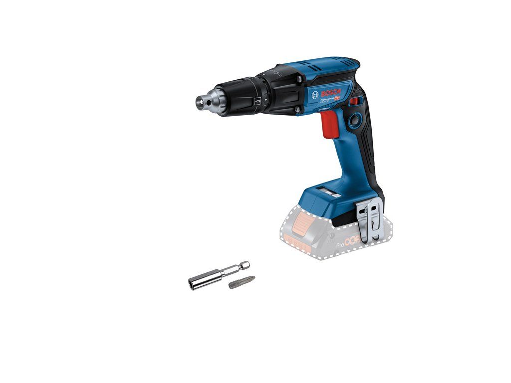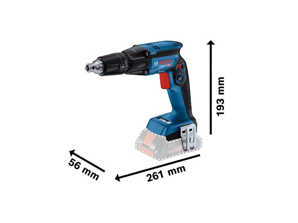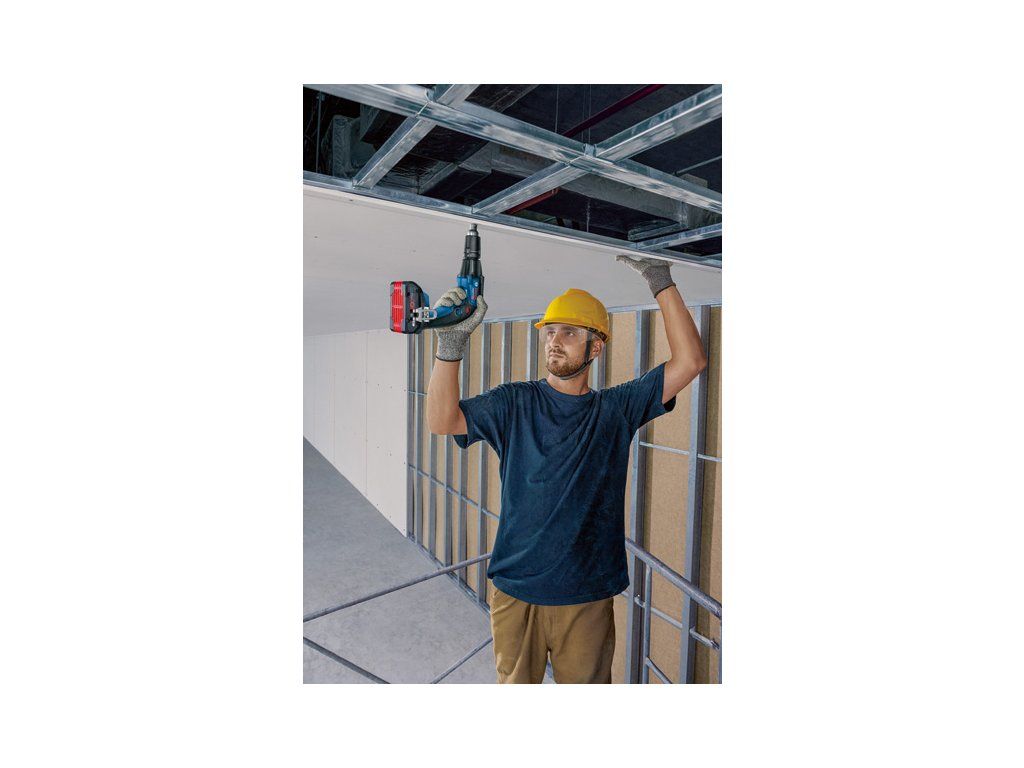 Akumulátorový sádrokartonářský šroubovák GTB 18V-45, Tento šroubovák s 4,500 ot/min je ideální na efektivní montáž sádrokartonových stěn a precizní utahování šroubů až do průměru 4,2 mm do sádrokartonu s lehkou ocelí o tloušťce 0,5 mm. Celodenní pohodlí pro vaše ruce Je vybaven elektronickou ochranou motoru (EMP), motorovou brzdou, aretačním tlačítkem, sponou na opasek a režimem zpětného chodu. Kartonová krabice; 1× šroubovací bit PH 2; 1× svorka na opasek, 1× držák bitůDoplňkové parametry