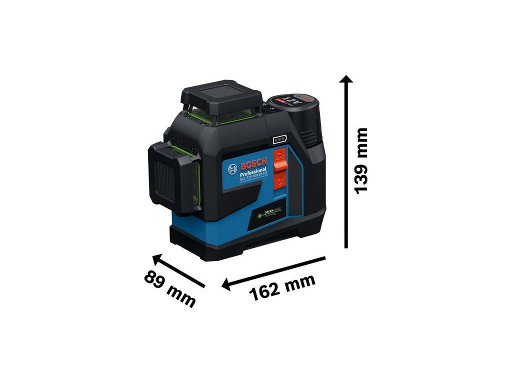 Čárový laser GLL 12V-100-33 CG, GLL 12V-100-33 CG Professional je robustní čárový laser, který nabízí snadné a intuitivní ovládání. Je navržen tak, aby odolal náročným podmínkám na staveništi, má pryží vyztužený kryt a laserová okénka a stupeň krytí IP 65 pro odolnost proti prachu a vodě. Aplikace Levelling Remote umožňuje dálkově ovládat laserové čáry 3× 360°, díky čemuž je ovládání přesnější a časově efektivnější. Duální zdroj napájení umožňuje flexibilně přepínat mezi 12V Li-Ion akumulátorem a alkalickými bateriemi AA jako záložním zdrojem napájení. GLL 12V-100-33 CG se snadno ovládá díky novému designu klávesnice pro přehlednou volbu laserové čáry a velkému indikátoru baterie pro větší pohodlí. Čárový laser je ideální pro vyrovnávání stěn a příček, pokládku obkladů a podlahových krytin či stavbu schodišť. Nabízí 3× laserovou čáru 360° pro současné horizontální a vertikální vyrovnávání, což umožňuje snadné rozvržení velkých prostor pomocí jediného nářadí. Pro okamžitý začátek práce je u GLL 12V-100-33 CG stále aktivní režim příjmu laserového paprsku. S volitelným laserovým přijímačem LR 7 Professional můžete prodloužit pracovní dosah až na 100 metrů (poloměr). Jasně zelené laserové čáry jsou až čtyřikrát viditelnější než červené a zajišťují přesnost při každém úkolu. Univerzální držák LB 10 Professional; 4× baterie 1,5 V LR6 (AA); Adaptér na alkalické baterie AA1 (1 608 M00 C1B); Cílová destička laseru; TaškaDoplňkové parametry