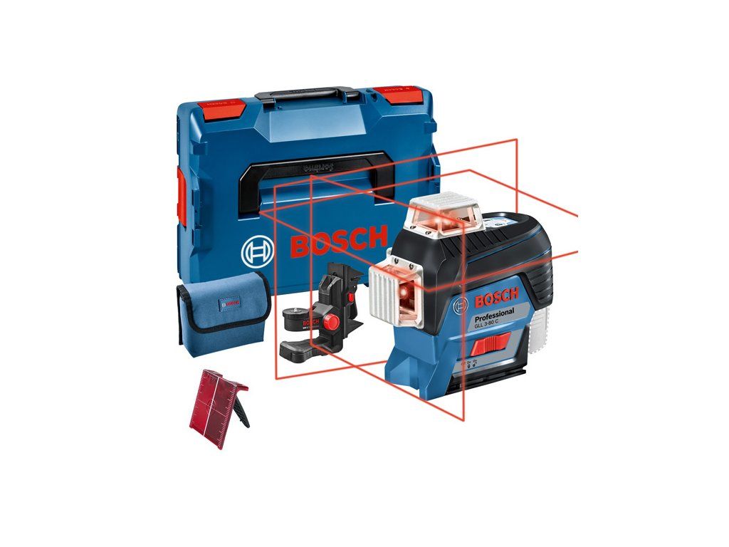Čárový laser GLL 3-80 C, Čárový laser GLL 3-80 C Professional je jednoduše připojený a promítá 3× 360° čáry pro vynikající viditelnost. Inovativní sledování CAL Guard a připojení k aplikaci v chytrém telefonu přes Bluetooth® umožňuje vzdálené ovládání, bezdotykové nastavení a vysokou přesnost. Vysoce výkonné diody zajišťují jasný obraz a tři 360° čáry souběžnou horizontální a vertikální nivelaci pro velmi efektivní práci. Tento čárový laser je určený na použití při stavbě podlah, montáži oken, instalaci polic, pokládání odpadního potrubí, konstrukci rámu pro sádrokartonovou stěnu a obkládání. Díky duálnímu zdroji napájení je možné GLL 3-80 C Professional používat jak s 12V Li-ion akumulátorem, tak se standardními alkalickými bateriemi, což zajišťuje ještě větší flexibilitu. Dokáže dosáhnout vyrovnání i na nerovné ploše až ±4° za méně než 4 sekundy s vynikající přesností ±0,2 mm/m*/** a pracovním rozsahem až 120 m při použití s volitelným přijímačem LR 6 nebo LR 7 Professional. Tento čárový laser je kompaktní, snadno se ovládá a je mimořádně robustní. Univerzální držák BM 1 Professional (0 601 015 A01); L-BOXX 136 (1 600 A01 2G0); Cílová destička laseru; TaškaDoplňkové parametry