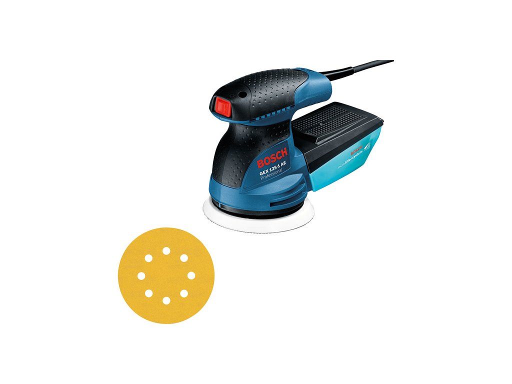 Excentrická bruska GEX 125-1 AE, GEX 125-1 AE Professional je excentrická bruska od firmy Bosch základní třídy v kategorii 125 mm určená na menší plochy a lokální opravy. Její kompaktní a ergonomická konstrukce s variabilními možnostmi úchopu poskytuje mimořádné pohodlí i při práci nad hlavou. Předvolba rychlosti umožňuje práci s různými materiály. Nádoba na prach je osazena vestavěným mikrofiltračním systémem Bosch zajišťujícím efektivní odsávání prachu pro prakticky bezprašnou práci. Tato excentrická bruska je určena na broušení, mezibroušení, odstraňování laku a na finální povrchové úpravy různých materiálů. Lze použít na dřevo, dýhu, lak, plniva i minerály a akryl. Je kompatibilní se systémem Bosch Click & Clean. GEX 125-1 AE Professional rovněž obsahuje 125mm brusnou podložku opatřenou systémem na suchý zip pro přichycení brusného papíru. Mikrofiltrační box (číslo náhradního dílu 2 609 199 133); 1× brusný list C430, Expert for Wood + Paint, 120 (dostupný samostatně jako sada 5 ks: 2 608 605 643)Doplňkové parametry