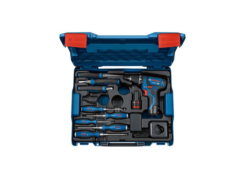 Kombinovaná sada GSR 12V-15 Professional a ruční nářadí; Ideální kombinace pro většinu základních prací a plnou flexibilitu na staveništi; Vynikající manipulace a bezpečnost díky kompaktní konstrukci a integrované elektronické ochraně článků Bosch; Dvourychlostní převodovka pro silný výkon a kompaktní design bez kabelů pro maximální volnost a snadnou manipulaci; Plná flexibilita s L-BOXX 102 díky vylepšenému řešení skladování a přepravy; 2× akumulátor GBA 12V 2.0Ah (1 600 Z00 02X); Nabíječka GAL 12V-20 ProfessionalDoplňkové parametry