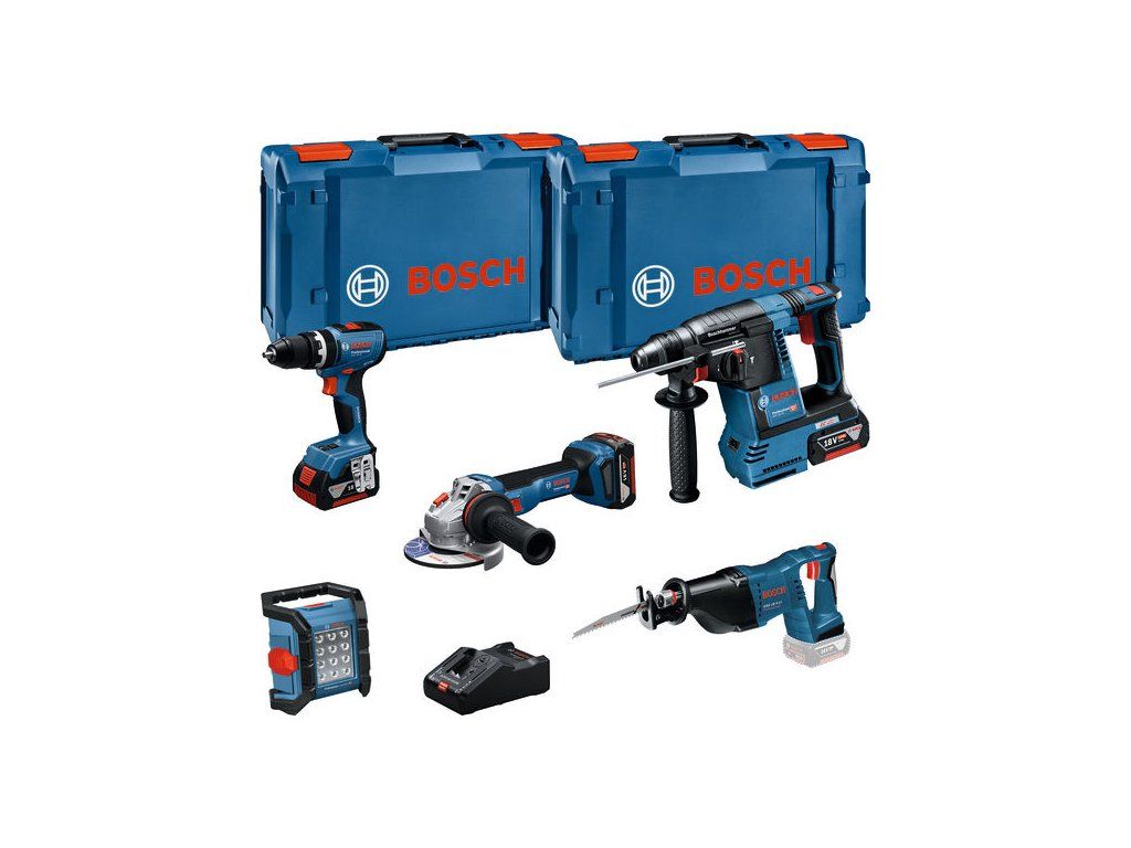 Kombinovaná sada Sada 5 ks 18V nářadí: GSB + GBH + GWS + GSA + GLI + 3× 5 + GAL; Perfektní kombinace profesionálního nářadí pro efektivní provedení práce.; Akumulátorový kombinovaný šroubovák GSB 18V-65 Professional (0 601 9N3 300); Akumulátorové vrtací kladivo GBH 18V-26 Professional (0 611 909 000); Akumulátorová úhlová bruska GWS 18V-11 Professional (0 601 9N4 100); Akumulátorová přímočará pila GSA 18 V-LI Professional (0 601 64J 000); Akumulátorová pracovní svítilna GLI 18V-1200 C Professional (0 601 446 700); 3× akumulátor GBA 18V 5.0Ah (1 600 A00 2U5); Rychlonabíječka GAL 18V-160 Professional (1 600 A02 T5G)Doplňkové parametry