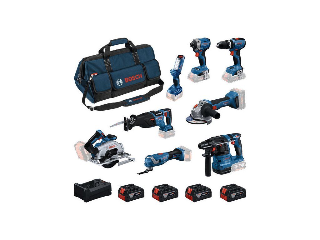 Kombinovaná sada Sada 8 kusů 18V nářadí: GSB + GDR + GBH + GWS + GKS + GSA + GOP + GLI + 4× GBA 18V 5.0Ah + GAL; Perfektní kombinace profesionálního nářadí pro efektivní provedení práce.; Rychlonabíječka GAL 12V/18V-80 (1 600 A03 7CH); Brašna na nářadí Bosch Professional, velká (1 600 A00 3BK); 4× akumulátor GBA 18V 5.0Ah (1 600 A00 2U5)Doplňkové parametry