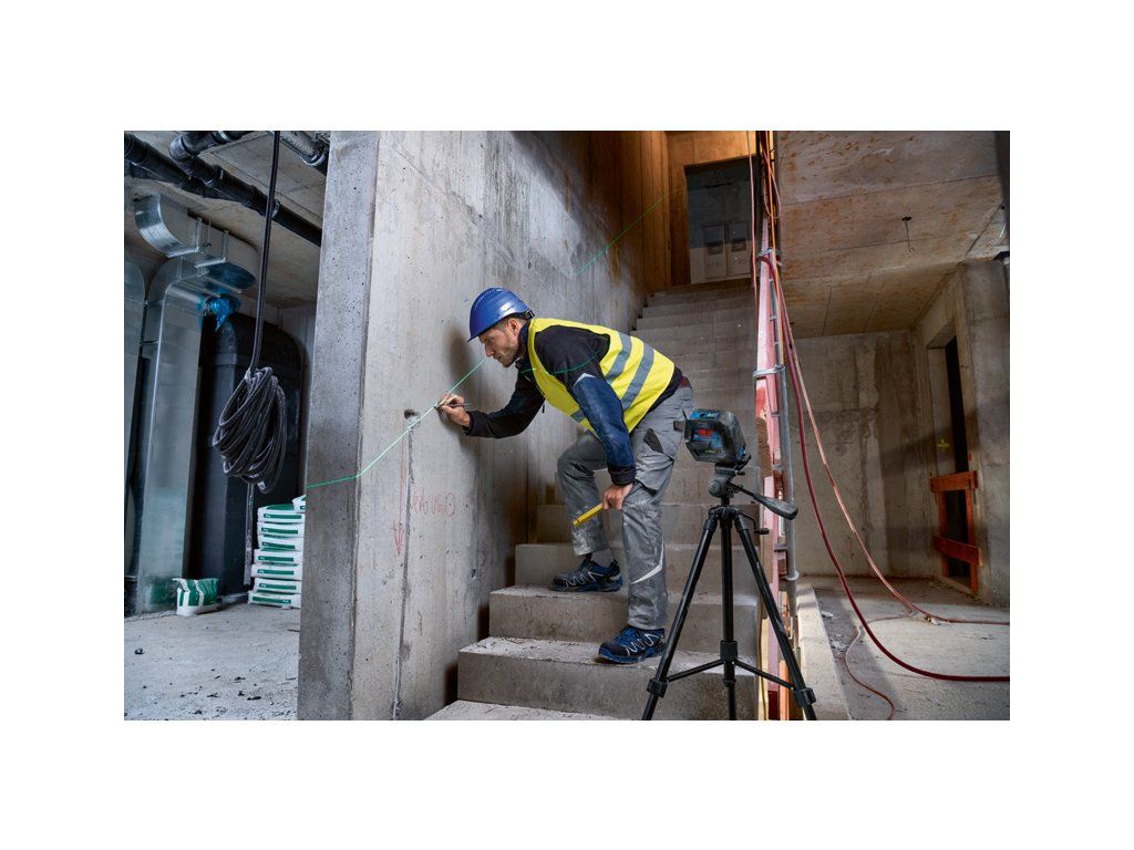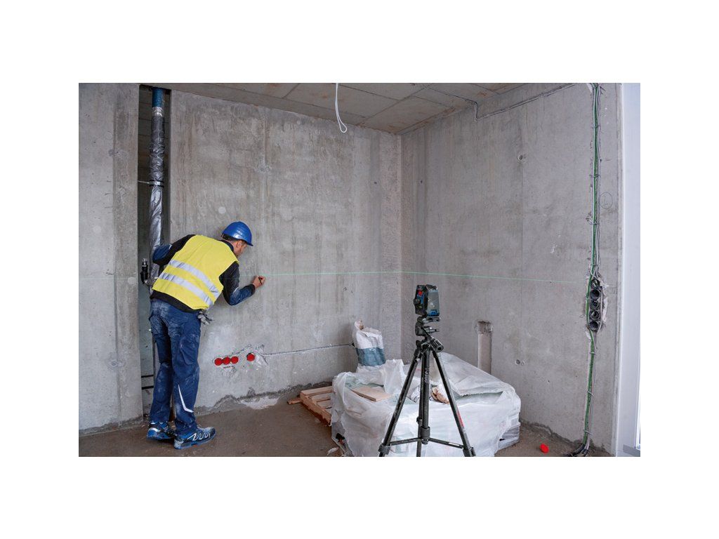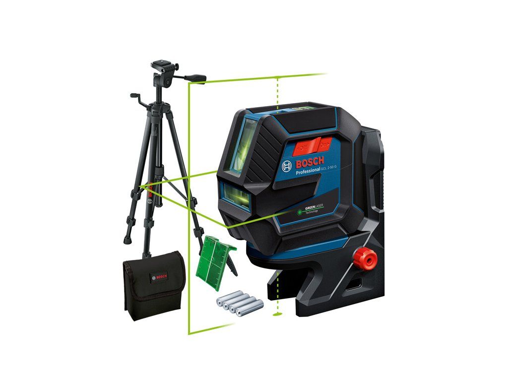 Kombinovaný laser GCL 2-50 G, Kombinovaný laser na staveniště GCL 2-50 G Professional usnadňuje zarovnávání a přenosy. Díky odolnému designu s pogumovaným krytem, který zajišťuje lepší ochranu zapuštěných skel, a stupni krytí IP 64 proti prachu a stříkající vodě je možné se stále soustředit na práci. Vypínač a jednotlačítková klávesnice usnadňují ovládání. Pro okamžitý začátek práce je u GCL stále aktivní režim příjmu laserového paprsku. Vysoce viditelné zelené laserové čáry a zelené kolmé body zaručují lepší viditelnost i v jasném prostředí. Rychlé a bezpečné upínání díky otočnému držáku RM 10 Professional s velmi silnými magnety. RM 10 Professional umožňuje přesné polohování laserových čar u kolmých bodů. Robustní GCL 2-50 G Professional je ideální na celou řadu aplikací, jako je montáž profilů na sádrokartonové stěny, montáž zásuvek a dveří a přenos bodů pro drobnější instalace. GCL 2-50 G Professional poskytuje dosah laserových čar až do 15 m (kolmé body: až do 10 m), který lze za pomoci volitelného přijímače LR 7 Professional prodloužit až na 50 m. RM 10 Professional je kompatibilní s volitelnou svorkou na strop DK 10 Professional pro použití na stropě či jemné seřizování výšky. Stavební stativ BT 150 Professional (0 601 096 B00); Otočný držák RM 10 Professional (0 601 092 A00); Cílová destička laseru; Taška; 4× baterie 1,5 V LR6 (AA)Doplňkové parametry