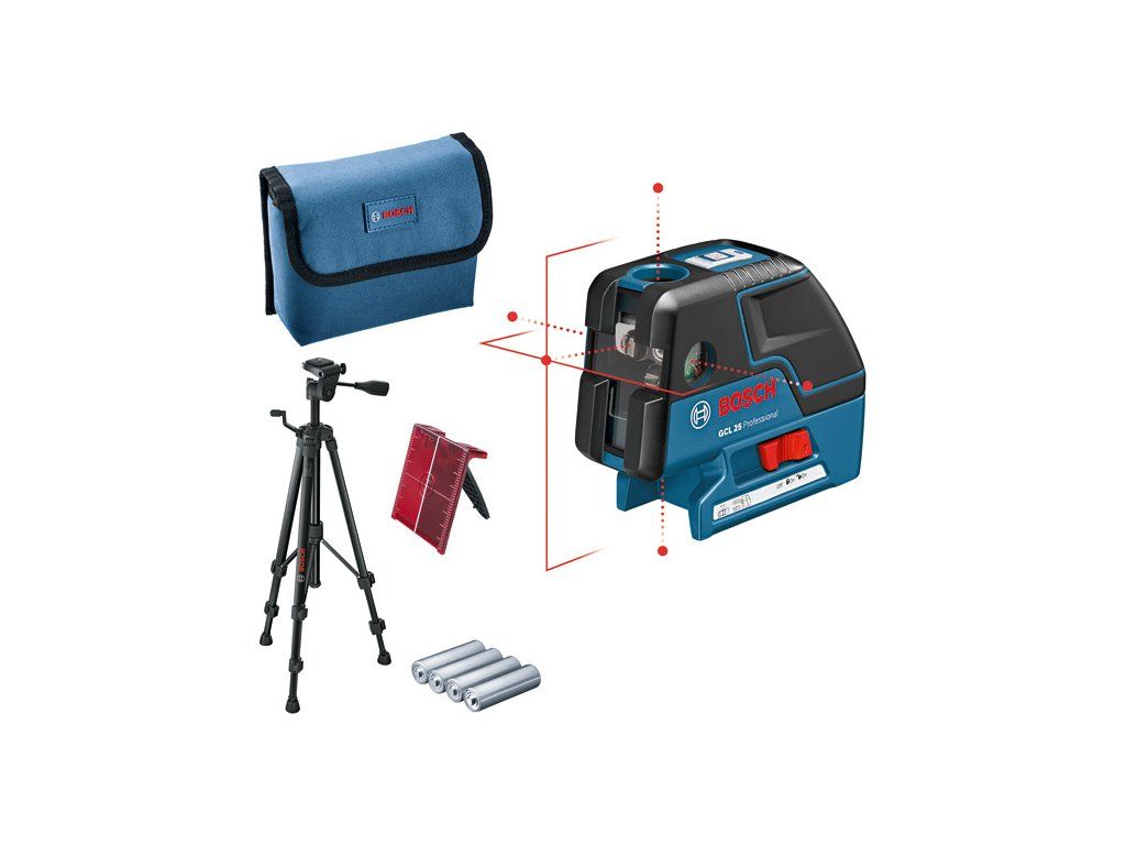 Kombinovaný laser GCL 25, Jednoduché řešení pro všechny nivelační práce a přenášení na krátké vzdálenosti, Neobyčejně mnohostranný: křížový laser a pětibodový laser v jednom, Jednoduchá obsluha díky intuitivnímu ovládání, Kompaktní a ergonomický design, Stavební stativ BT 150 Professional (0 601 096 B00); Cílová destička laseru; Vložka na nářadí pro L-BOXX; Ochranné pouzdro; 4× baterie 1,5 V LR6 (AA)Doplňkové parametry