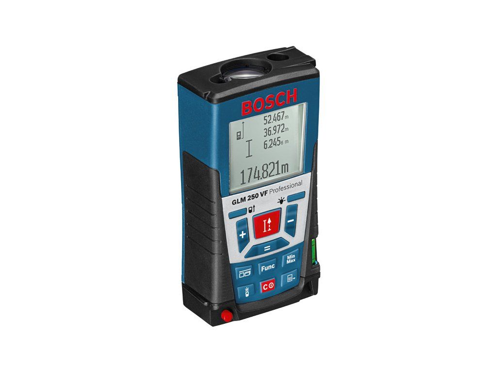 Laserový měřič vzdálenosti GLM 250 VF, Laserový dálkoměr s největším dosahem, Ideální pro venkovní použití: integrovaný cílový optický hledáček pro optimální viditelnost laserového bodu do vzdálenosti 250 m, Maximální měřicí výkon a přesnost i za nepříznivých světelných podmínek díky velké skleněné čočce a keramickému držáku optiky, Četné, snadno ovladatelné měřicí funkce pro rychlý a přesný výpočet délek, ploch a objemů, Certifikát výrobce; Ochranné pouzdro; Nosné poutko; 4× baterie 1,5 V LR03 (AAA)Doplňkové parametry