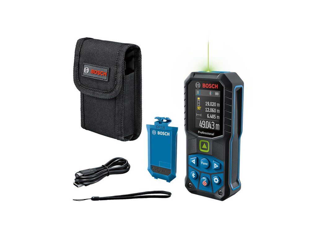 Laserový měřič vzdálenosti GLM 50-27 CG, Laserový měřič GLM 50-27 CG Professional nabízí vynikající viditelnost laserového bodu, vysoce odolný design a rychlá dokumentace. Jeho zelený laserový bod je ve srovnání s červeným laserem viditelnější, proto je obzvláště vhodný pro měření na velké vzdálenosti ve světlých vnitřních podmínkách. Díky kombinaci konstrukce s certifikací ochrany IP65 a pryžového krytu tlumícího nárazy, vydrží i pád z 1,5 metru i na tvrdý beton, proto je vhodný i do drsných podmínek staveniště. Připojení Bluetooth® a aplikace Bosch MeasureOn zajišťují rychlou dokumentaci a bleskový přenos výsledků měření. Tento laserový měřič je optimální pro dokumentaci, výpočet potřeb materiálu, prostorů a stěn a umístění montážních prvků, takže je ideální pro architekty, elektrikáře a mnoho dalších profesí. Je vybaven zvukovou i vibrační zpětnou vazbou, která ověřuje úspěšnost měření a vylepšenou výdrží akumulátoru (ve srovnání s předchůdcem GLM 50 C Professional). Taška; BA 3.7V 1.0Ah A a kabel USB-C® (1 608 M00 C43); Nosné poutkoDoplňkové parametry