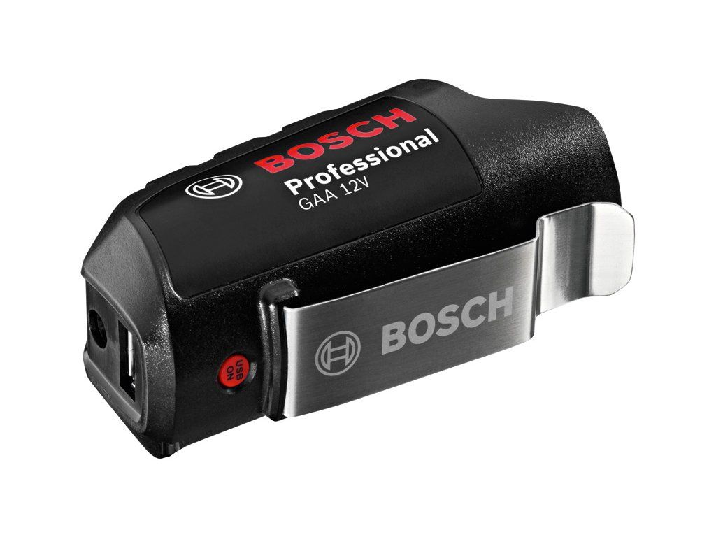 Nabíječka GAA 12 V-LI, Mnohostranné využití energie akumulátoru, Prodloužení doby chodu USB zařízení: napájení pro mobilní telefony a spoustu dalších přístrojů, které se nabíjí přes USB, prostřednictvím integrovaného USB rozhraní, Kompaktní a šikovná – ideální na cesty: nabíječku USB lze díky kompaktní konstrukci uložit do taštičky a pomocí kovové spony připevnit na pásek, Využití stávajících akumulátorů: nabíječka je kompatibilní s akumulátory Bosch Professional 12 V s 1,5 Ah, 2,0 Ah nebo 4,0 AhDoplňkové parametry