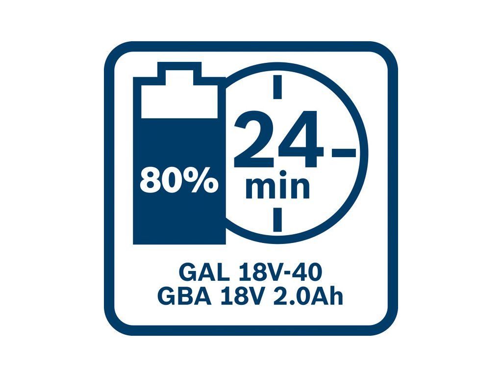 Nabíječka GAL 18V-40, Toto nářadí nabízí moderní design, který vede k velmi vysoké kompaktnosti. Nabíjecí proud 4 A nabije akumulátor GBA 18V 4.0Ah až na 80 % za pouhých 48 minut a akumulátor GBA 18V 2.0Ah až na 80 % za 24 minut. Tato kompaktní nabíječka je součástí 18V systému Bosch Professional a je 100% kompatibilní se všemi 18V akumulátory Bosch Professional. GAL 18V-40 navíc nabízí možnost montáže na stěnu. Kompatibilní také s AMPShare, aliancí akumulátorů více značek. Kartonová krabice; Rychlonabíječka GAL 18V-40 Professional (1 600 A01 9RJ)Doplňkové parametry