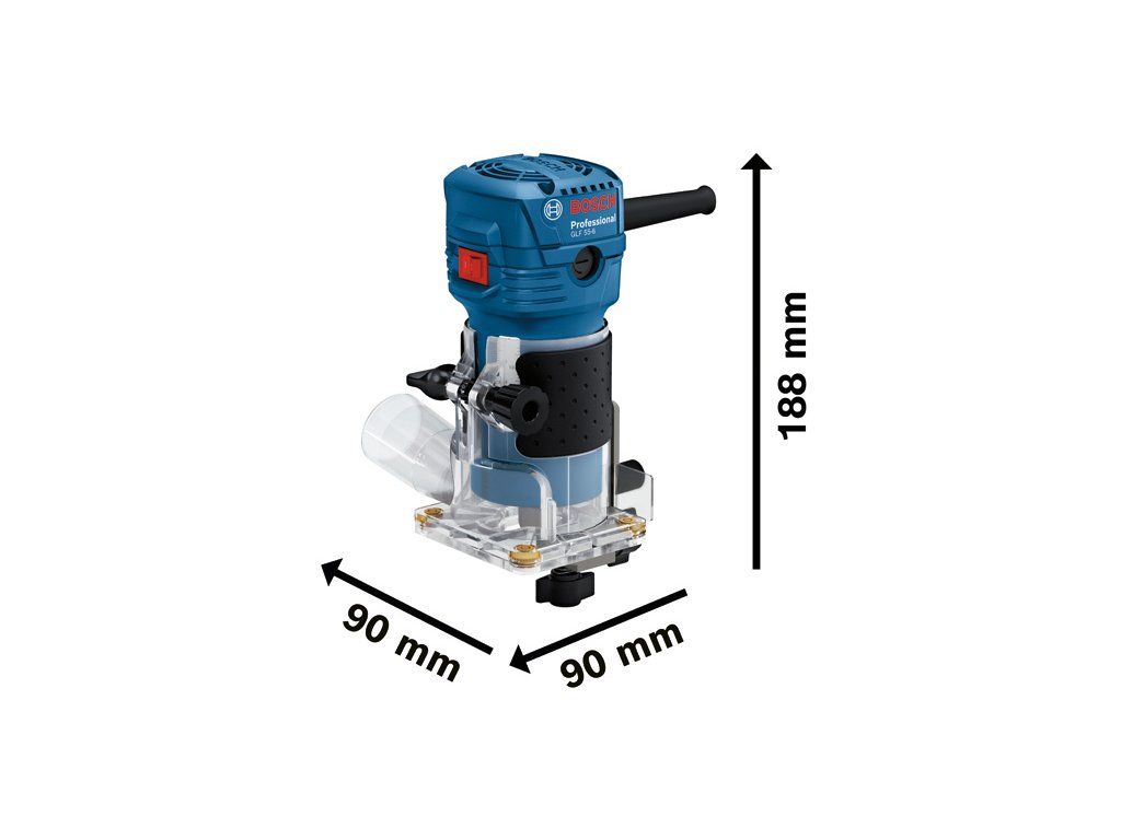 Ohraňovací frézka GLF 55-6, GLF 55-6 je vybaven 550W motorem otáčejícím se rychlostí 33 000 ot/min, který zajišťuje rychlé a čisté výsledky řezání. Hloubku řezu lze snadno nastavit díky mechanismu se soukolím hřeben–pastorek. Tato profesionální laminátová frézka se vyznačuje ultrakompaktním designem a úzkou úchopovou plochou pro snadné ovládání nářadí jednou rukou. Přiložené vodicí kolečko pro zarovnávací řezání umožňuje provádět zarovnávací frézování se standardní frézou s rovnými drážkami, čímž se zabrání riziku poškození jemné dýhy, což je běžný jev při použití tradičních fréz s ložiskovým vedením na opracování laminátu. Přiložený boční doraz poskytuje větší univerzálnost pro frézování drážek a průhledná polykarbonátová základna propouští více světla do oblasti řezu pro maximální viditelnost a zároveň pomáhá minimalizovat celkovou velikost a hmotnost nářadí. Pevná základna (1 619 PB2 369); Boční doraz (2 608 000 331); Vodicí váleček na zarovnávací řezy (2 608 000 332); Odsávací adaptér (2 608 000 804); Upínací kleštiny 6 mm (1 619 PB3 058); Kopírovací objímka (2 609 110 223); 10mm klíč (2 609 110 254); 17mm klíč (1 619 PB2 377)Doplňkové parametry
