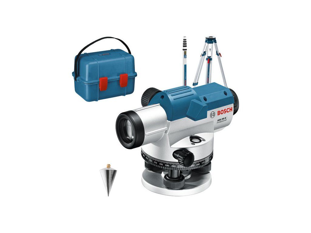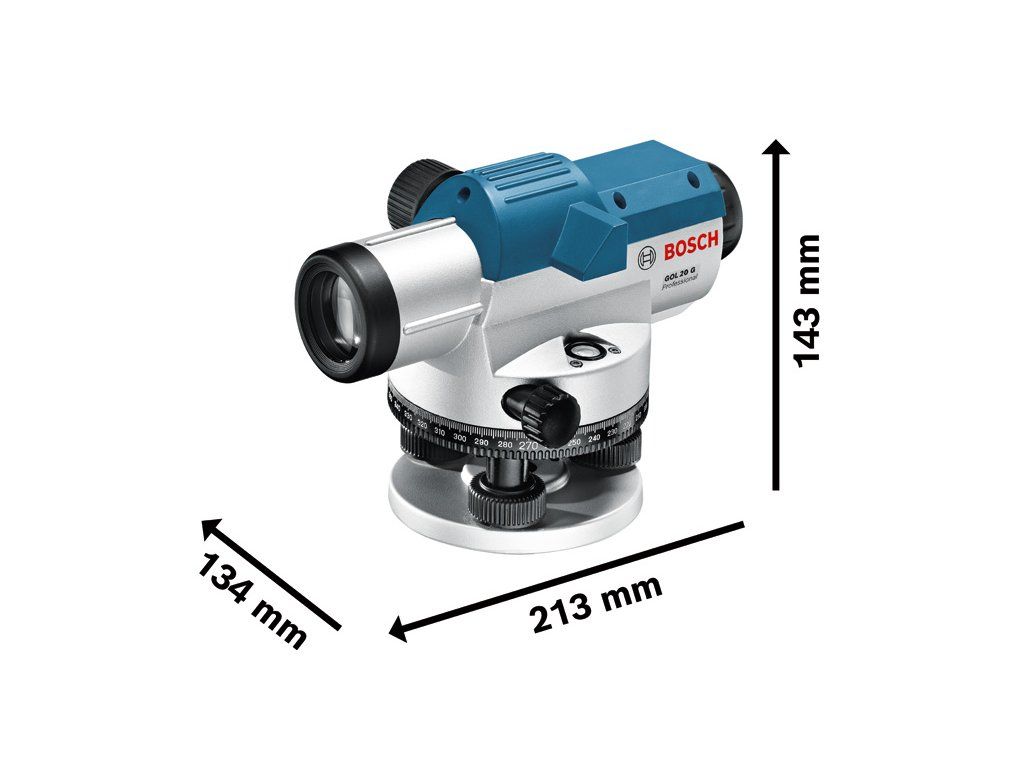 Optický nivelační přístroj GOL 20 G, Robustní a spolehlivý – optimální pro použití ve venkovním prostředí, Ideální pro použití ve venkovním prostředí díky robustnímu krytu s ochranou proti prachu a stříkající vodě (IP 54), Objektiv s vysokou světelností pro ostré zobrazení cíle, Bezpečná přeprava díky zajištění kompenzátoru, Krytka čočky; Seřizovací kolík; Olovnice; Transportní kufr (1 600 A00 0LF); Stavební stativ BT 160 Professional (0 601 091 200); Měřicí lať GR 500 Professional (0 601 094 300)Doplňkové parametry