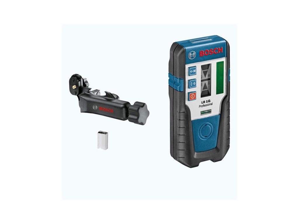 Přijímač laserového paprsku LR 1G, Širší využití s nabízeným příslušenstvím, Šikovný přijímač do vnitřního i venkovního prostředí s dosahem až 150 m v kombinaci s rotačním laserem GRL 300 HVG Professional, Optický a akustický ukazatel roviny zeleného laserového paprsku, Ochrana proti prachu a stříkající vodě (IP 65), Držák (1 608 M00 70F); 1× baterie (blok) 9 V (6LR61)Doplňkové parametry