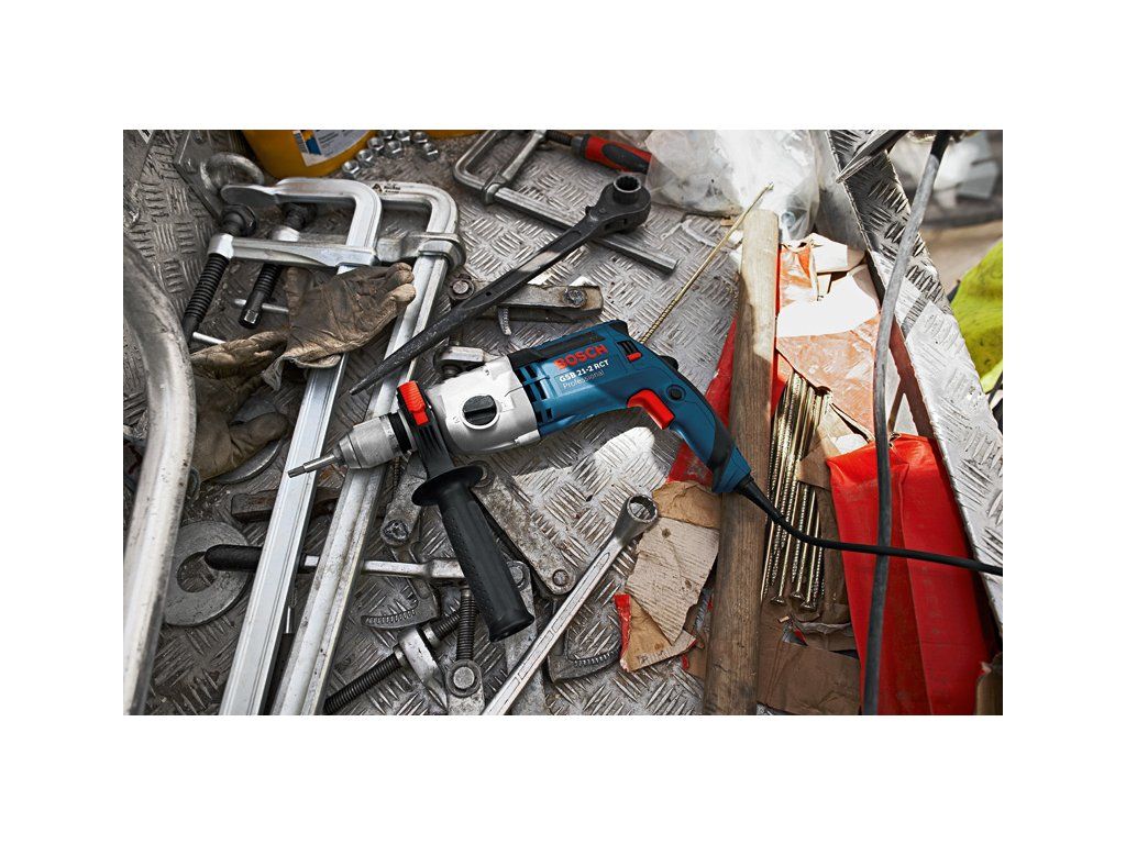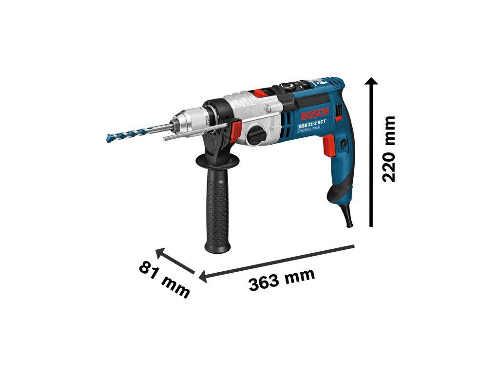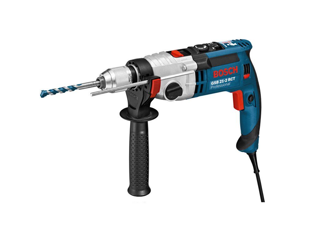Příklepová vrtačka GSB 21-2 RCT, GSB 21-2 RCT Professional je dvoustupňová síťová příklepová vrtačka s konstantními otáčkami a předvolbou momentu určená na tu nejnáročnější práci. Díky silnému 1 300W motoru s vysokým krouticím momentem je ideální pro náročné použití. Vyznačuje se systémem konstantních otáček, který udržuje zvolenou pracovní rychlost i při intenzivní zátěži. Řízení krouticího momentu příklepové vrtačky umožňuje předvolbu momentu pro vysoce přesnou práci. Toto nářadí je určeno k vrtání do zdiva, kamene, dřeva a kovu. Je kompatibilní s nástavcem na odsávání prachu GDE 16 Cyl Professional. GSB 21-2 RCT Professional obsahuje funkce, jako je Autolock, Power Control, spojka pro řízení otáček a volba rychlosti. Přídavná rukojeť ( 2 602 025 193); Příruční kufr (2 605 438 524); Hloubkový doraz 210 mm (1 613 001 010); Rychloupínací sklíčidlo 13 mm (2 608 572 150)Doplňkové parametry