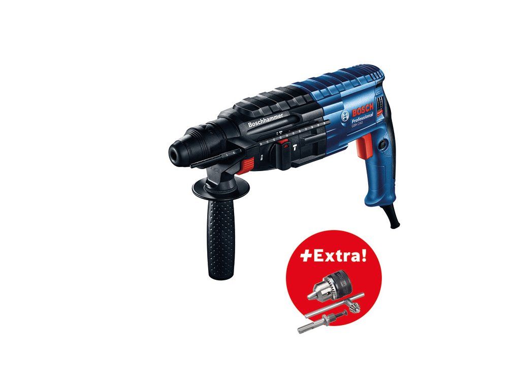 Profesionální sada: Vrtací kladivo GBH 240 + sklíčidlo s klíčem; Nejlepší pracovní výsledky díky skvělé kombinaci elektrického nářadí a příslušenství.; 1× upínací stopka vrtacího sklíčidla SDS plus (číslo náhradního dílu 1 617 000 154); Sklíčidlo (1 608 571 088); Kufr (1 619 P10 938)Doplňkové parametry