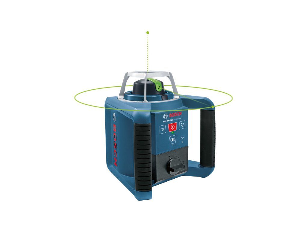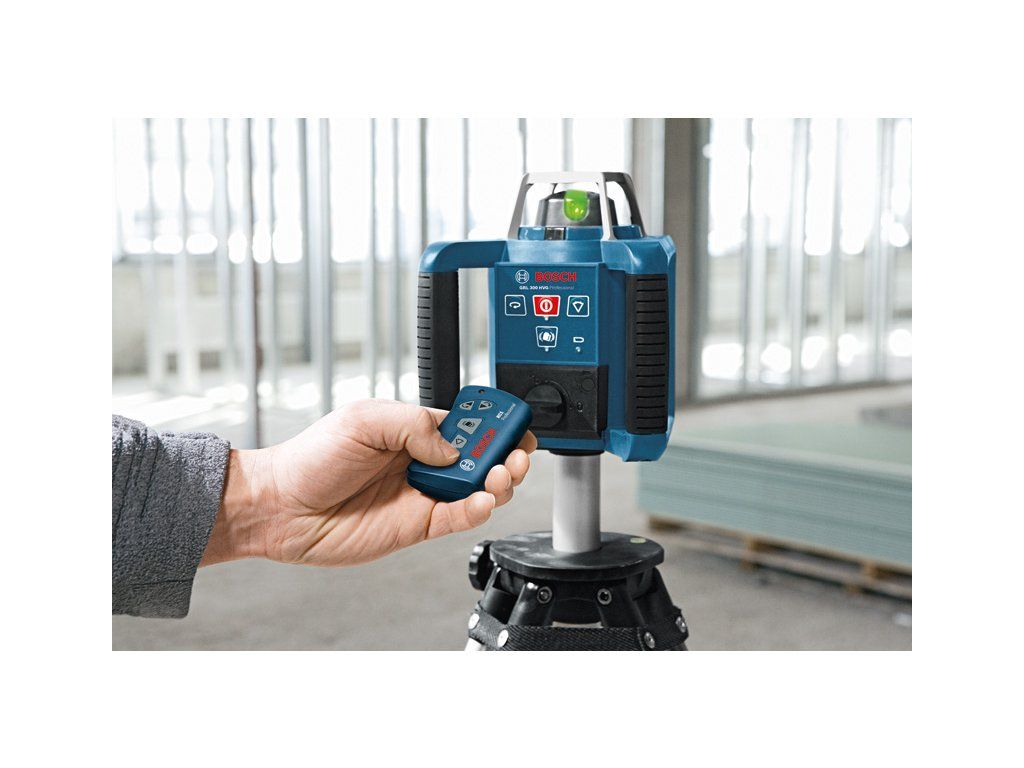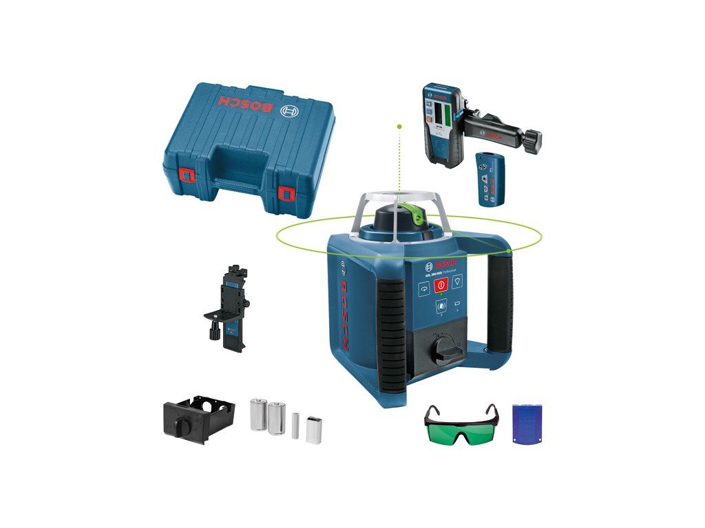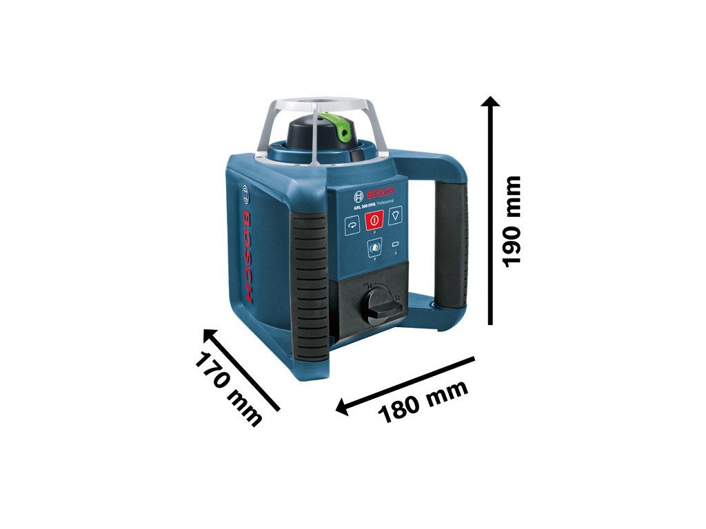 Rotační laser GRL 300 HVG, Vynikající viditelnost pro použití ve vnitřním prostředí, Zelená čára laseru: až čtyřikrát lepší viditelnost oproti červené čáře, Rychle nastavitelný v horizontálním a vertikálním směru díky automatické samonivelaci v rozsahu 8 % (±5°), Zapínatelná funkce varování před nárazem zabraňuje nesprávné nivelaci při vibracích nebo otřesech, Laserový přijímač LR 1G Professional (0 601 069 700); Držák (1 608 M00 70F); Dálkové ovládání RC1 Professional (0 601 069 900); Univerzální držák WM 4 Professional (0 601 092 400); Přihrádka na akumulátor (číslo náhradního dílu 1 608 M00 05D); Cílová destička laseru (modrá) (číslo náhradního dílu 1 608 M00 05K); Brýle pro práci s laserem (zelené) (číslo náhradního dílu 1 608 M00 05J); 1× baterie (blok) 9 V (6LR61); 2× baterie 1,5 V LR20 (D); 1× baterie 1,5 V LR6 (AA); Příruční kufr (číslo náhradního dílu 1 608 M00 05F)Doplňkové parametry