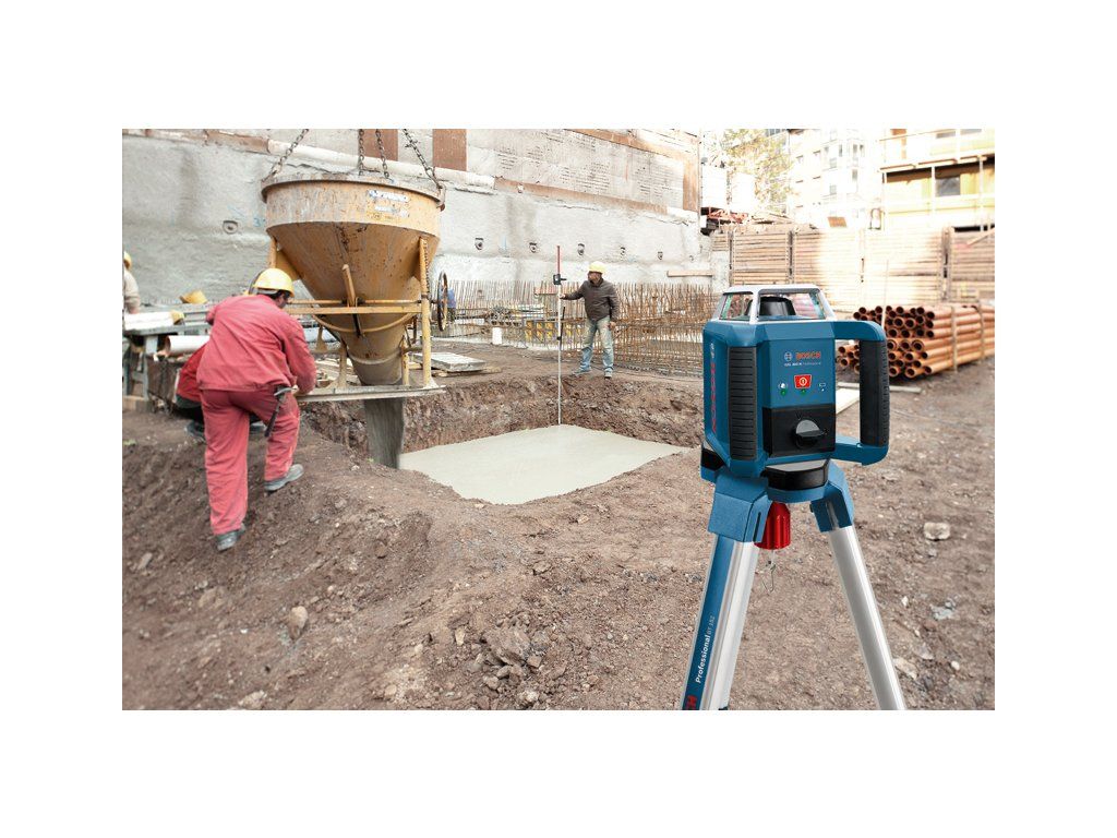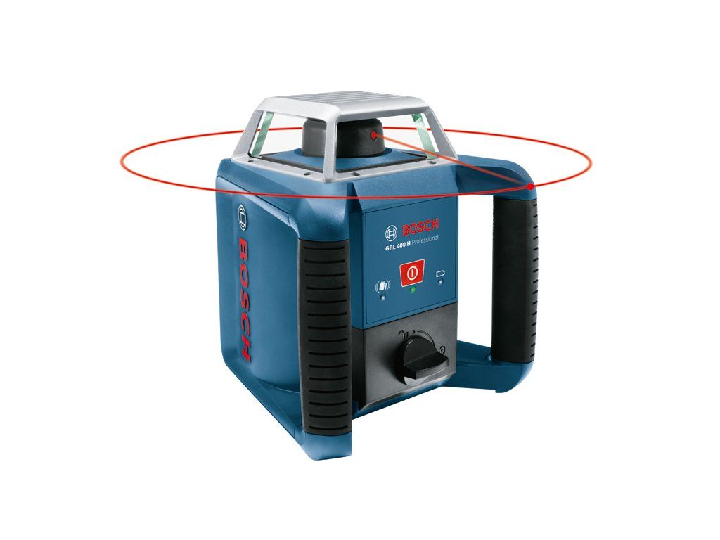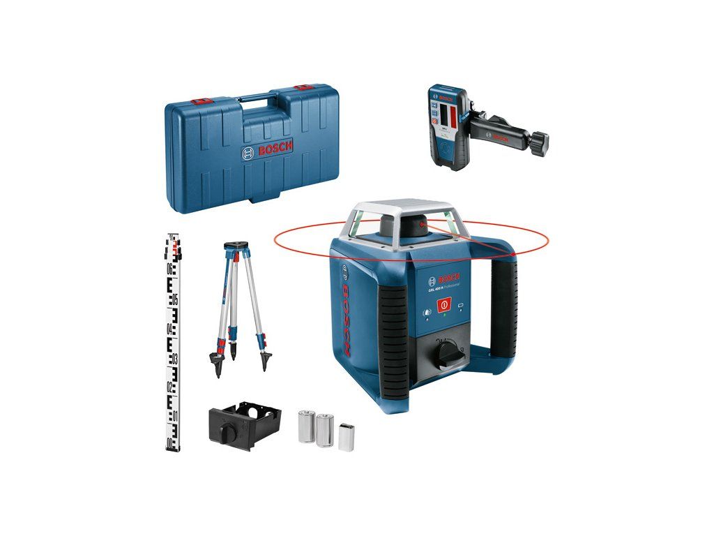 Rotační laser GRL 400 H Set, Jednoduché používání a připravenost k použití – intuitivní jednotlačítkový rotační laser GRL 400 H je vždy okamžitě připraven k použití při nivelacích v exteriéru. Díky jednotlačítkové klávesnici, funkci elektronické samonivelace a praktickému držáku na akumulátor umožňuje bezproblémovou práci se snadným sestavením a jednoduchou výměnou akumulátoru – i bez přesouvání nářadí. S přesností ±2,4 mm na 30 m a systémem upozornění na náraz ADS, který informuje o změně polohy nářadí, GRL 400 H předchází chybám při nivelaci a zajišťuje konzistentně přesné výsledky. Od vyměřování hodnot při provádění výkopů a základů přes nivelaci bednění až po krajinářství – toto nářadí odvádí vynikající práci. Tento rotační laser díky ochraně proti vodě a prachu IP 56 obstojí v náročných podmínkách na každém venkovním pracovišti. Rotační laser GRL 400 H Professional; Laserový přijímač LR 1 Professional (0 601 015 400); Stavební stativ BT 152 Professional; Měřicí lať GR 2400 Professional; Příruční kufr; Přihrádka na baterie (1 609 203 M02); 2× baterie 1,5 V LR20 (D); 1× baterie (blok) 9 V (6LR61)Doplňkové parametry