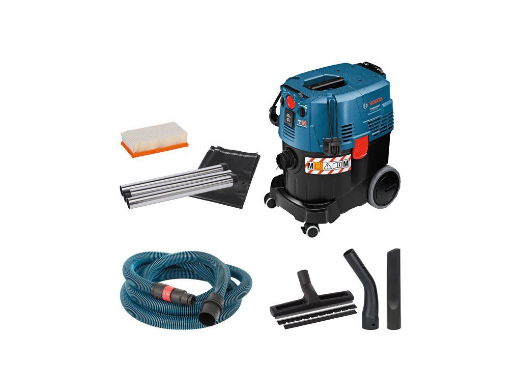 Síťový vysavač GAS 35 M AFC, GAS 35 M AFC Professional je všestranný síťový vysavač na suché i mokré sání Bosch třídy M s automatickým čištěním filtru. Vyznačuje se technologií automatického čištění filtru, které zaručuje trvale výkonné sání a umožňuje rychlý postup práce. Vysavač nese certifikát pro vysavače třídy M v souladu s normami EU, který zaručuje výbornou ochranu uživatele. Rovněž se vyznačuje mimořádně výkonnou 1 380W sací turbínou, která zajišťuje vysoký podtlak 254 mbar pro nejlepší výsledky odsávání. Tento vysavač je určen na mokré a suché sání. Dodává se s nádobou o objemu 35 litrů a je kompatibilní se systémem Bosch Click & Clean. L-BOXX lze pohodlně zacvaknout do GAS 35 M AFC Professional, které poskytuje praktické přepravní řešení pro vylepšenou mobilitu. Štěrbinovitá hubice, průměr 35 mm (2 607 000 165); Odpadní sáček (2 607 432 043); Koleno (2 608 000 573); Podlahová hubice, průměr 35 mm (1 609 390 478); 1× plochý skládaný filtr PES (2 607 432 034); 3× 0,35m sací trubice chromovaná, 35 mm průměr (2 608 000 575); Hadice 5 m, průměr 35 mm, antistatická, s objímkou pro nářadí (2 608 000 566)Doplňkové parametry