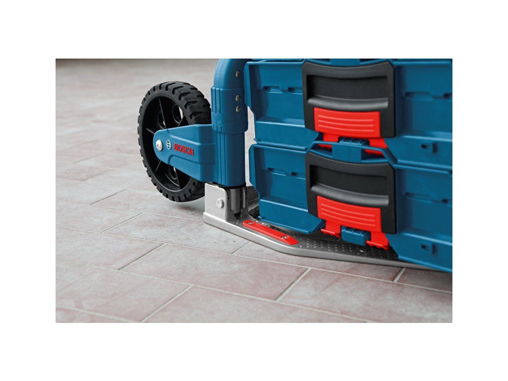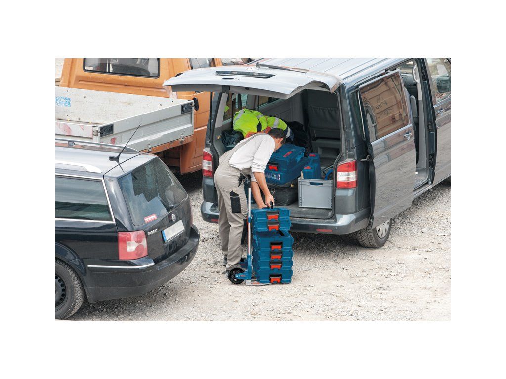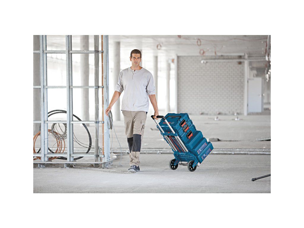 Skládací rudl Aluminium Caddy, Hliníkový vozík zajišťuje pohodlnou přepravu v souladu se systémem Bosch Mobility System. Je vyroben z hliníku a vybaven skládací rukojetí a kolečky pro lehké a prostorově úsporné skladování. Kompatibilní základna a elastický pásek bezpečně upevňují stohované L-BOXXy pro bezpečnou přepravu. S nosností 125 kg na zemi a 60 kg na schodech je tento vozík stabilní a robustní. Představuje ideální přepravní řešení pro boxy L-BOXX a L-Case.Doplňkové parametry