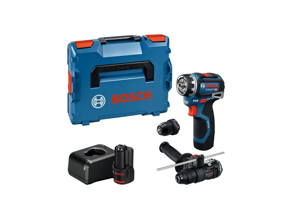 Šroubovák GSR 12V-32 FC, Akumulátorové nářadí PRO GSR12V-32 FC nabízí nejlepší kontrolu díky technologii Advanced KickBack Control. Tato technologie minimalizuje riziko zranění, pokud se vrták náhle zasekne nebo se nářadí pomalu otáčí kolem své osy vrtání a přídržná síla se pomalu zvyšuje. Tento vrtací šroubovák je vysoce všestranný díky systému Bosch Professional FlexiClick se snadno vyměnitelnými nástavci pro vrtání a šroubování. Nářadí je díky své vysoce kompaktní konstrukci ideální pro vrtání a šroubování ve stísněných prostorách. S jedinečným nástavcem vrtacího kladiva PRO GFA12-H lze nářadí přeměnit na vrtací kladivo SDS plus, připravené na příklepové vrtání do betonu až do Ø10 mm. Excentrický nástavec PRO GFA12-E usnadňuje přesnou práci v blízkosti okrajů a stěn, zatímco pravoúhlý nástavec PRO GFA 12-W promění vrtací šroubovák v úhlovou vrtačku. Tyto nástavce lze nastavit do 16 různých poloh v úhlu 360° bez odepínání z nářadí. Nástavce FlexiClick mohou nahradit specializované nářadí pro příležitostné použití, což znamená nižší hmotnost při přenášení na stavbě. Systém Bosch Professional FlexiClick: Dokonale vybavené pro profesionální práci. PRO GSR12V-32 FC je perfektní pro všechny způsoby šroubování a vrtání do dřeva či kovu a v kombinaci s PRO GFA 12-H i betonu, zdiva a kamene. Další informace: PRO GSR12V-32 FC je vybaven funkcí Advanced KickBack Control, bezuhlíkovým motorem, jasným pracovním světlem a sponou na opasek. L-BOXX 102 (1 600 A01 2FZ); Nabíječka GAL 12V-20 Professional; 2× akumulátor GBA 12V 2.0Ah (1 600 Z00 02X); Kovový nástavec s vrtacím sklíčidlem GFA 12-M (1 600 A03 7MD); Nástavec vrtacího kladiva GFA 12-H (1 600 A02 4LN); Přídavná rukojeť; Hloubkový doraz (1 613 001 009)Doplňkové parametry