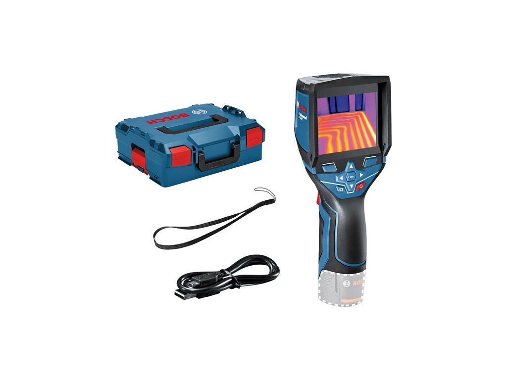 Termokamera GTC 400 C, Termokamera GTC 400 C Professional během několika sekund změří a znázorní teplotní rozdíly a snadno zaznamenává výsledky. Aplikace Bosch ThermalOn rychle dokumentuje a předává naměřené hodnoty. Inteligentní technologie snímek v snímku překrývá reálný a termální snímek (19 200 PX) a výsledkem je vysoce kvalitní obrazová dokumentace a přesná lokalizace teplotních rozdílů. Díky duálnímu systému napájení lze používat jak 12V Li-ion akumulátor, tak standardní alkalické baterie. Ideální na kontrolu izolace, topných systémů, proudění tepla a na vyhledání přehřátých částí. Chytrý přístroj GTC 400 C Professional je perfektní pomocník pro řadu specialistů v každé fázi projektu: od konzultace se zákazníky a zobrazení jasných aktuálních snímků přes přípravné práce, např. lokalizaci stávajících rozvodů, po projektovou dokumentaci i následné práce. Tento měřicí nástroj nesmí být použit pro lékařské účely na člověku. L-BOXX 136 (1 600 A01 2G0); Vložka na nářadí pro L-BOXX; Kabel mikro USB (2 609 120 670); Poutko na zápěstíDoplňkové parametry