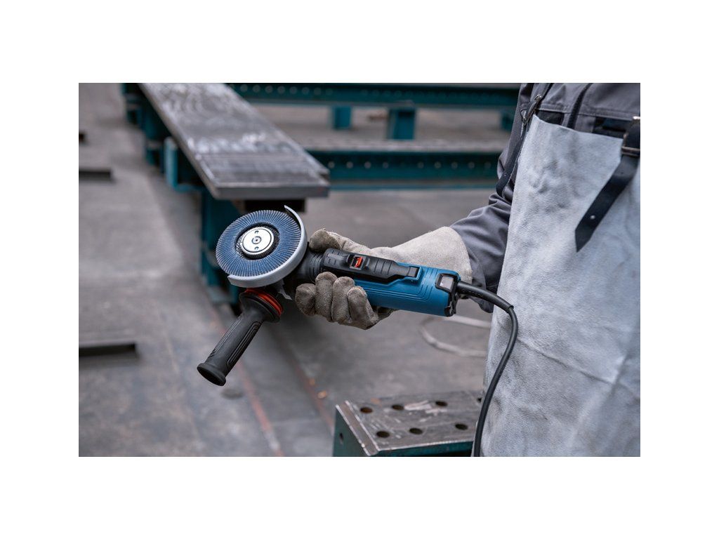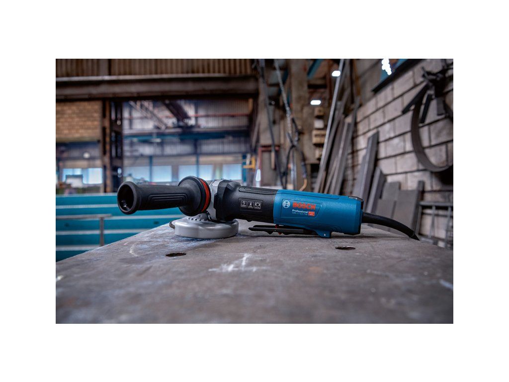 Úhlová bruska GWS 17-125 PSB, GWS 17-125 PSB Professional se vyznačuje novým spínačem PROtection pro maximální pohodlí při práci a ergonomickým a štíhlým designem rukojeti. Spínač PROtection okamžitě po uvolnění spouště vypne úhlovou brusku. Funkce Intelligent Brake System navíc zajistí rychlé zastavení kotouče. Výkonná malá úhlová bruska nabízí vylepšenou ochranu vůči prachu díky průduchům na zadní straně nářadí. Pro vysokou úroveň ochrany uživatele je GWS 17-125 PSB vybavena funkcí KickBack Control. GWS 17-125 PSB Professional se dokonale hodí na broušení kovu či svarů a dělení kovu, betonu, cihel a obkladů. Je kompatibilní se systémy na odsávání prachu Bosch GDE 125 EA-T Professional a GDE 115 / 125 FC-T Professional. Pyšní se rovněž funkcemi Speed Selection, Constant Speed, Soft Start a Overload Protection. Kartonová krabice; Přídavná rukojeť s tlumením vibrací (2 608 900 000); Ochranný kryt (1 605 510 365); Nacvakávací ochranný kryt na řezání – kov (2 608 000 756); Kolíkový klíč (1 607 950 043); Upínací příruba (1 605 703 099); Upínací matice (1 603 340 040); Filtr na prach (2 608 000 824); Rychloupínací matice SDS (1 603 340 031)Doplňkové parametry