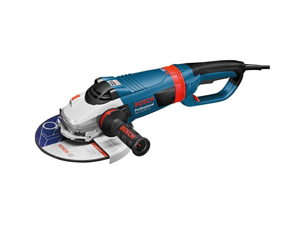 Úhlová bruska GWS 26-230 LVI, Velká síťová úhlová bruska GWS 26-230 LVI Professional poskytuje nejsilnější dostupný výkon a vysokou ochranu uživatele během provozu v kategorii Bosch 2 600 W. Vysoký výkon pro velmi náročnou práci zajišťuje působivý motor o výkonu 2 600 W. Funkce KickBack Control a ochrana proti opětovnému spuštění brusky posunula bezpečnost uživatele na obzvláště vysokou úroveň. Hlavní a přídavná rukojeť s funkcí Vibration Control navíc snižují vibrace až o 50 %. Toto nářadí je určeno na řezání a broušení kovu, dlaždic a cihel. Je kompatibilní s prachovým nástavcem GDE 230 FC-T Professional a systémem na odsávání prachu Bosch Click & Clean. GWS 26-230 LVI Professional je také vybavena ochranným krytem. Upínací příruba (1 605 703 099); Ochranný kryt s rychlonastavováním (2 605 510 281); Rychloupínací matice SDS (1 603 340 031); Kolíkový klíč (1 607 950 048); Přídavná rukojeť s tlumením vibrací (2 602 025 181)Doplňkové parametry