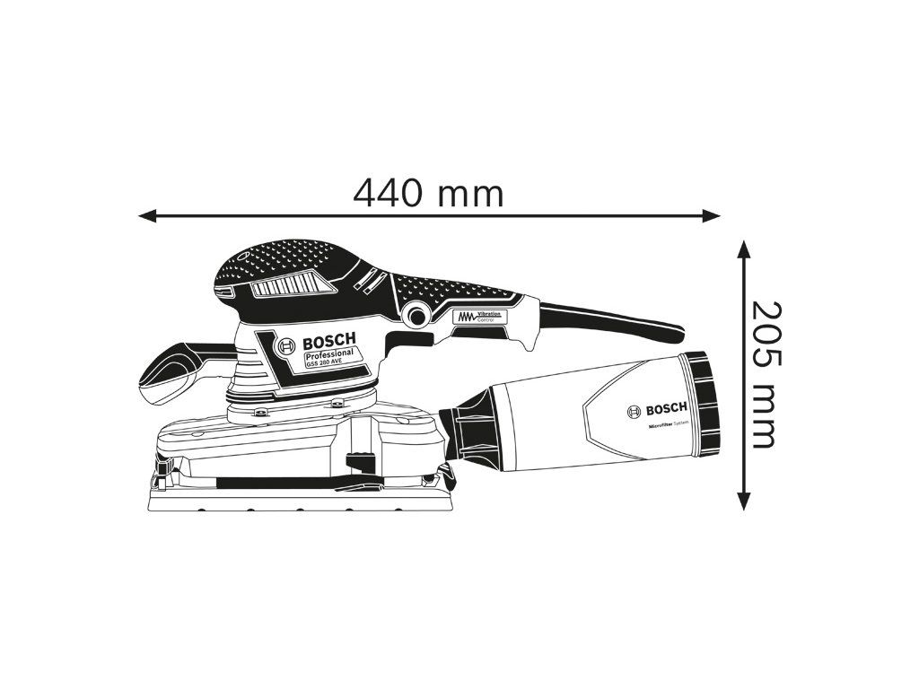 Vibrační bruska GSS 280 AVE, GSS 280 AVE Professional je síťová vibrační bruska od firmy Bosch kategorie 280 mm pro vysoce kvalitní opracování povrchu. Vyznačuje se konstrukcí s oddělenou brusnou jednotkou pro rovnoměrný přítlak zaručující ty nejlepší výsledky. Jedinečná vestavěná technologie zajišťuje tlumení vibrací na minimum a tím umožňuje nepřetržitou práci. Brusné papíry se k vibrační brusce snadno a dokonale připevňují pomocí podložky se suchým zipem a upínacího systému. Je určena na broušení, mezibroušení a broušení rámů i na opracování povrchů a hodí se na dřevo, dýhu, lak, plniva i minerály a akryl. Je kompatibilní se systémem Bosch Click & Clean. GSS 280 AVE Professional zahrnuje rovněž nádobu na prach s vestavěným mikrofiltračním systémem Bosch i možnost volby rychlosti. Kartonová krabice; 1× brusný list C470, Best for Wood + Paint, 80 (dostupný samostatně jako sada 10 ks: 2 608 605 267); 1× brusný list C470, Best for Wood + Paint, 120 (dostupný samostatně jako sada 10 ks: 2 608 605 268); 1× brusný list C470, Best for Wood + Paint, 180 (dostupný samostatně jako sada 10 ks: 2 608 605 269); Přídavná rukojeť (2 602 026 175)Doplňkové parametry