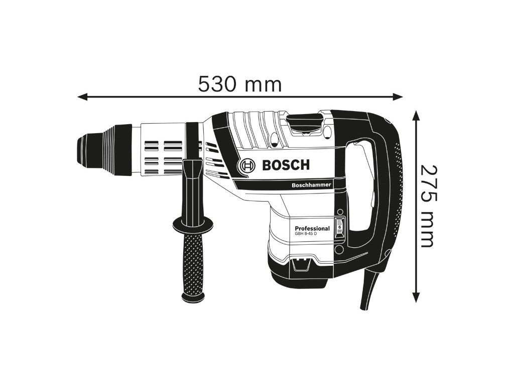 Vrtací kladivo s SDS max GBH 8-45 D, GBH 8-45 D Professional je všestranné výkonné nářadí v kategorii síťových vrtacích kladiv SDS max díky svým univerzálním schopnostem. Dokonalý poměr výkonu a hmotnosti mu umožňuje snadno provádět celou řadu úloh pro nářadí SDS max. Toto vrtací kladivo rovněž obsahuje robustní kovové součástky pro ještě vyšší odolnost. Jeho silný motor přináší příklepovou energii 12,5 J pro rychlý postup vrtání a vysoký úběr materiálu. Toto nářadí je určeno pro vrtání do průměru 45 mm a střední sekací práce do betonu a kamene. Je kompatibilní s různými nástavci na odsávání prachu. GBH 8-45 D Professional také obsahuje funkce, jako je Constant Speed, Restart Protection, Rotation Control Clutch a Speed Selection. Příruční kufr (číslo náhradního dílu 1 615 438 51A); Přídavná rukojeť (číslo náhradního dílu 1 612 025 004); Tuba s mazacím tukem (číslo náhradního dílu 1 615 430 010); Utěrka na nářadíDoplňkové parametry