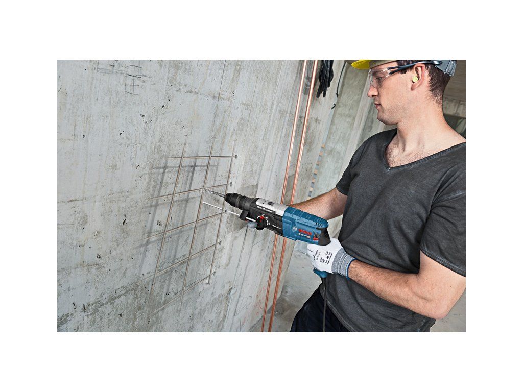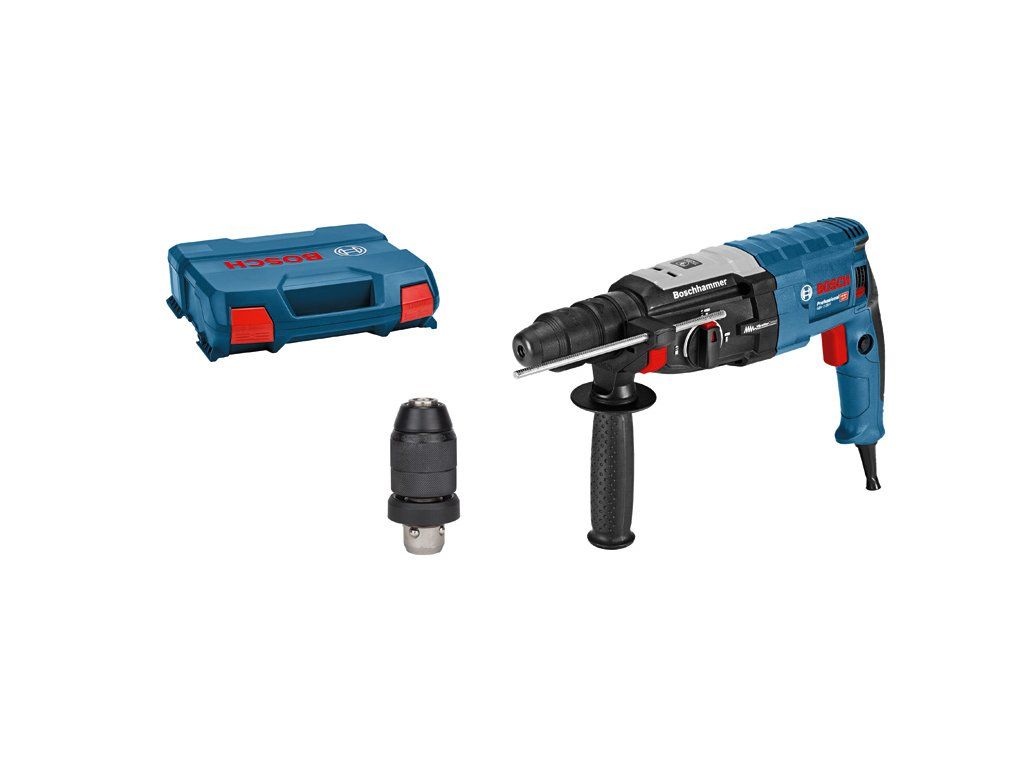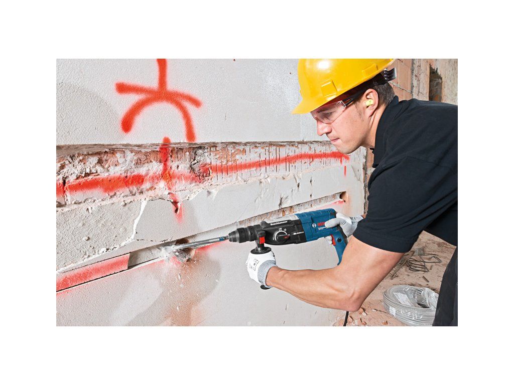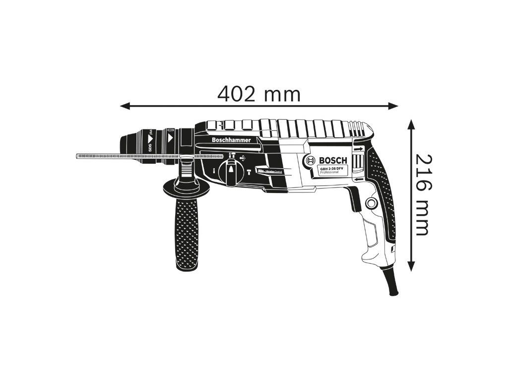 Vrtací kladivo s SDS plus GBH 2-28 F, GBH 2-28 F Professional s rychlovýměnným sklíčidlem je nejsilnější nářadí v kategorii 2kg síťových vrtacích kladiv SDS plus firmy Bosch. Robustní motor zajišťuje mimořádnou příklepovou energii 3,2 J pro vysoce účinné vrtání. Vrtací kladivo se rovněž vyznačuje funkcemi KickBack Control pro vyšší ochranu uživatele a Vibration Control pro snadnou dlouhodobou práci bez přerušování. Toto nářadí je určeno na vrtání a sekání do betonu, zdiva, dřeva a kovu. Je kompatibilní s různými nástavci na odsávání prachu. GBH 2-28 F Professional obsahuje také funkce, jako je Reverse Mode, Rotation Control Clutch, Variable Speed a Vario-Lock. Přídavná rukojeť ( 2 602 025 141); Příruční kufr; Hloubkový doraz 210 mm (1 613 001 010); Utěrka na nářadí; Rychlovýměnné sklíčidlo 13 mm (2 608 572 212); Výměnné sklíčidlo SDS plus (2 608 572 213)Doplňkové parametry