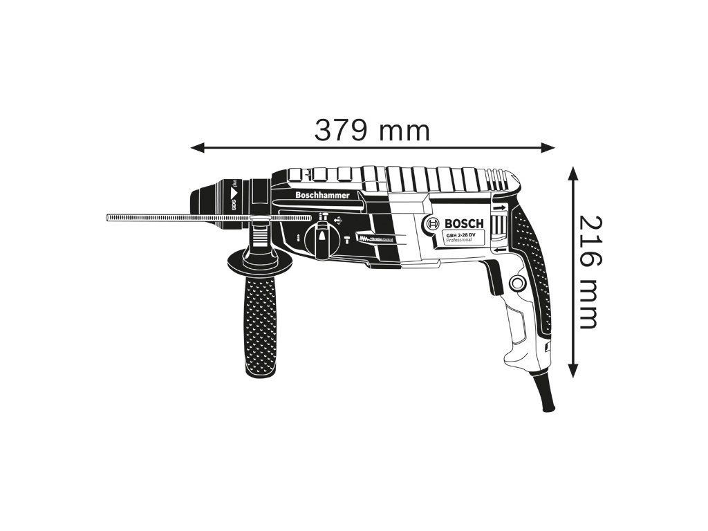 Vrtací kladivo s SDS plus GBH 2-28, Jedná se o nejsilnější nářadí v kategorii 2kg síťových vrtacích kladiv SDS plus firmy Bosch. Robustní motor zajišťuje mimořádnou příklepovou energii 3,2 J pro vysoce účinné vrtání. Vrtací kladivo se rovněž vyznačuje funkcemi KickBack Control pro vyšší ochranu uživatele a Vibration Control pro snadnou dlouhodobou práci bez přerušování. Toto nářadí je určeno na vrtání a sekání do betonu, zdiva, dřeva a kovu. Je kompatibilní s různými nástavci na odsávání prachu. Nářadí nabízí také funkce, jako je Reverse Mode, Rotation Control Clutch, Variable Speed a Vario-Lock. Přídavná rukojeť ( 2 602 025 141); Hloubkový doraz 210 mm (1 613 001 010); Vložka pro L-BOXX; L-BOXX 136 (1 600 A01 2G0); Utěrka na nářadíDoplňkové parametry