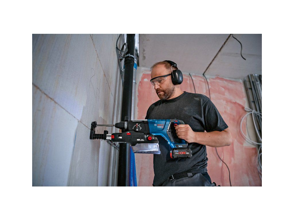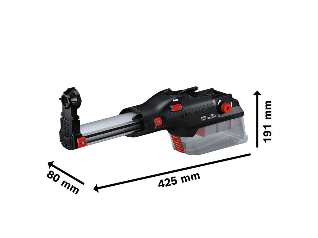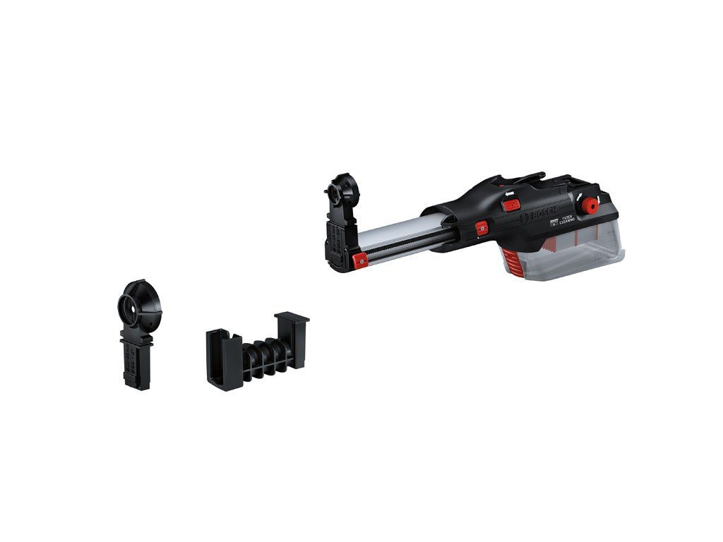 Zabudovaný vysavač GDE 28 D, Lehké integrované odsávání prachu: GDE 28 D Professional. Díky velmi kompaktní a lehké konstrukci o hmotnosti pouhých 0,8 kg nabízí vynikající ergonomii. Lze jej sestavit snadno jediným nacvaknutím a nádobu na prach lze pohodlně vysypat bez snímání filtru. Mechanismus čištění filtru, který vyklepává vysoce kvalitní HEPA filtr, pomáhá udržovat konstantní průtok vzduchu a zajišťuje mimořádné výsledky při odsávání prachu. Vysoce flexibilní díky dvěma vyměnitelným prachovým okům pro vrtání až do průměru 28 mm a prodloužením na vrtáky délky až 265 mm – ideální na širokou škálu prací. Integrovaný nástavec na odsávání prachu se hodí při vrtání nebo vrtání s příklepem s GBH 18V-28 DC Professional. GDE 28 D Professional je vybaven průhlednou nádobou na prach pro sledování naplnění a nastavení hloubky vrtání. Protiprachové očko pro pevná sklíčidla, průměr 16 mm (1 600 A01 E28); Protiprachové očko pro pevná sklíčidla, průměr 28 mm (1 600 A01 E29); Prodloužení (1 600 A01 E27); Kartonová krabiceDoplňkové parametry